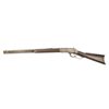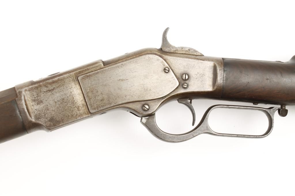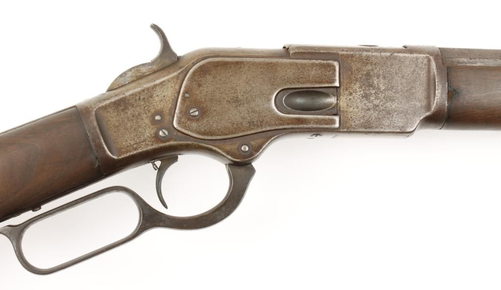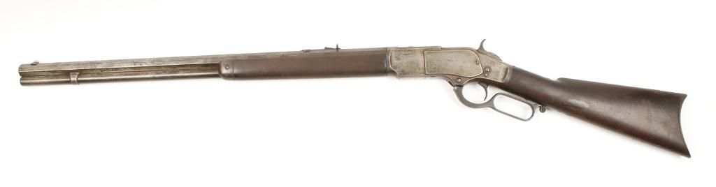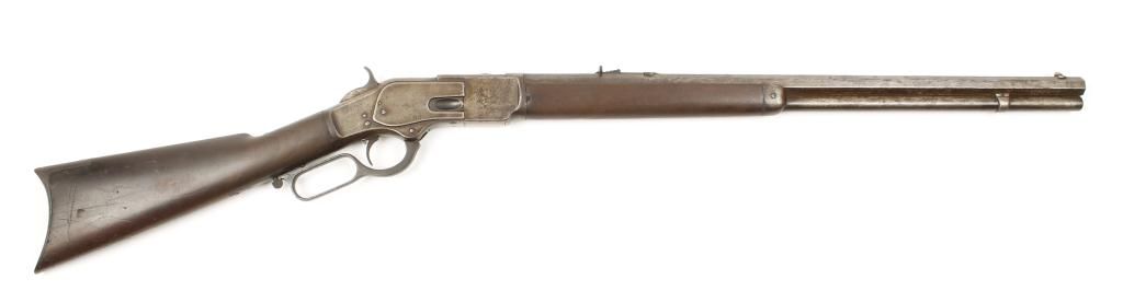Winchester Model 1873 1st model with desirable early raised thumb print dust cover in .44-40 caliber, 24” octagon barrel, full magazine, rifle butt, serial number 1256. This rifle shows a factory set trigger andpossibly was targeted as it is near the early 1 of 1000 serial number range. The metal surfaces show a brown patina finish with some faint traces of blue at the edges and where protected. The rifle shows scattered light to moderate erosion and pinprick pitting and the barrel address is visible but slightly light. The model marking on tang is also partially visible under the patina. The stocks are good and show some light cleaningwith steel wool but no sanding and some scratches, small chips, minor losses and normal use. The dust cover shows some wear to the checkering but is original and fits and matches patina well. The metal surfaces showa coating of dried oil and the action works well and the bore is fair. The sights are in their correct position and it would be difficult to find an earlier 1873 also it would be interesting to write for a letter as