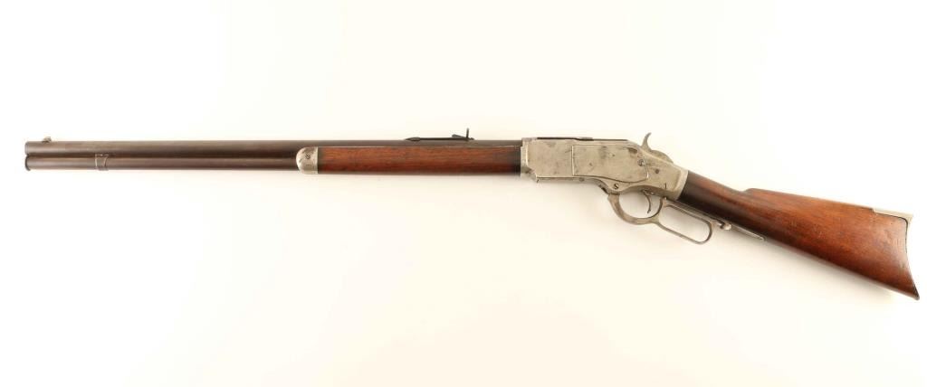 'Third Model' Scarce antique lever action repeating rifle chambered in .22 Short Rimfire, manufactured circa 1888. The Winchester 1873 .22 Rimfire rifle was the first .22 caliber repeating rifle produced in American and suffered diminutive sales due to the preference of larger-caliber rifled at the time. Production numbers of the .22 caliber model is estimated to be 19,552 which accounts for a mere 2.78% of the total production. Features a blued 24 5/16" round barrel marked ""WINCHESTER'S-REPEATING-ARMS. NEW HAVEN. CT./KING'S-IMPROVEMENT-PATENTED-MARCH 29. 1866. OCTOBER 16. 1860", dovetailed front sight with German silver blade, semi-buckhorn adjustable rear sporting sight, full-length tube magazine, smooth trigger, knurled hammer spur, sliding dust cover with serrations along the rear edges, smooth walnut forend with metal cap, and straight grip shoulder stock with crescent metal buttplate. The barrel and magazine tube are blued with the finish turned to a smooth aged brown patina. The remainder of the metal surfaces display an old nickel plated finish with approximately 70% plating intact overall. The action performs well, the bore is fair, markings are faint but legible and the refinished wood stocks are good with small losses, minor hairline cracks extending from the upper tang & some shrinkage around the buttplate. Condition is NRA Good. ***Antique Firearm***