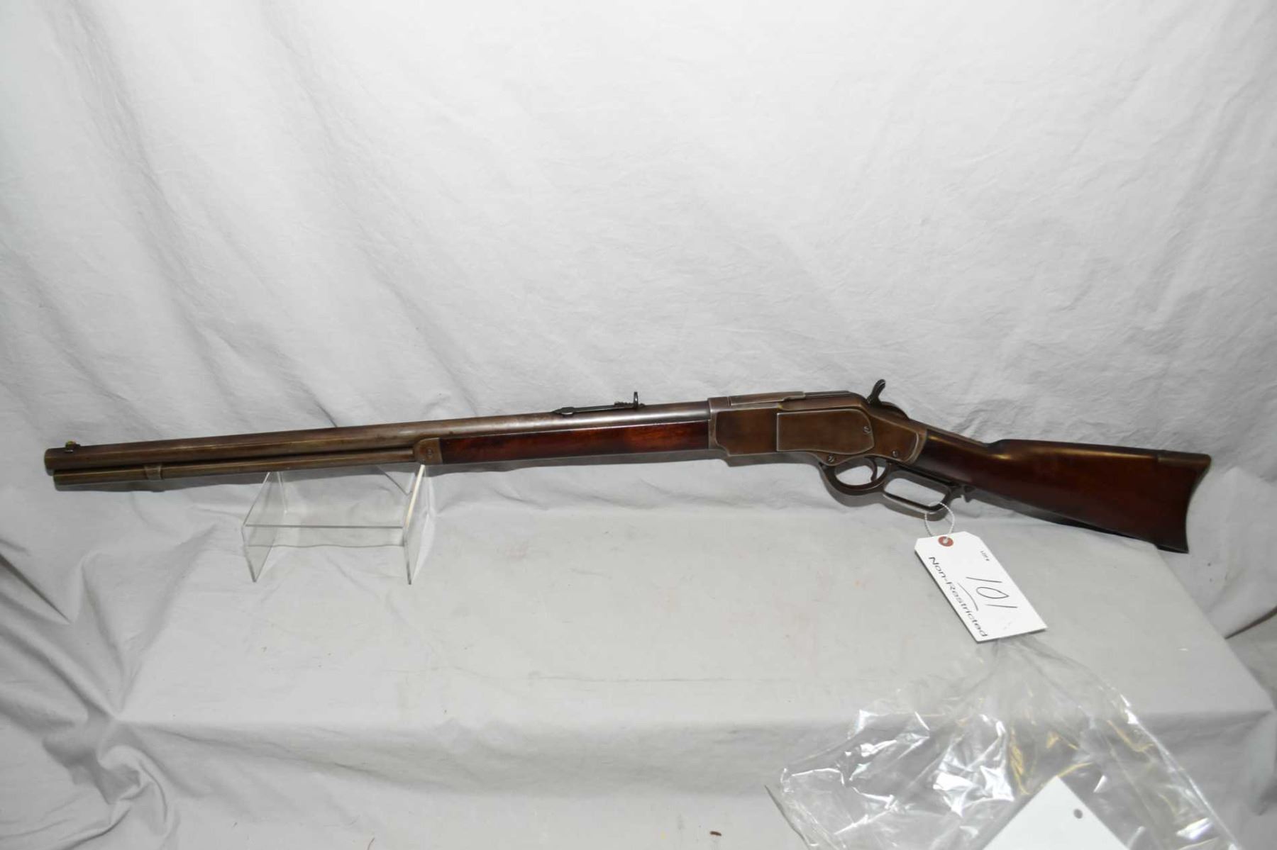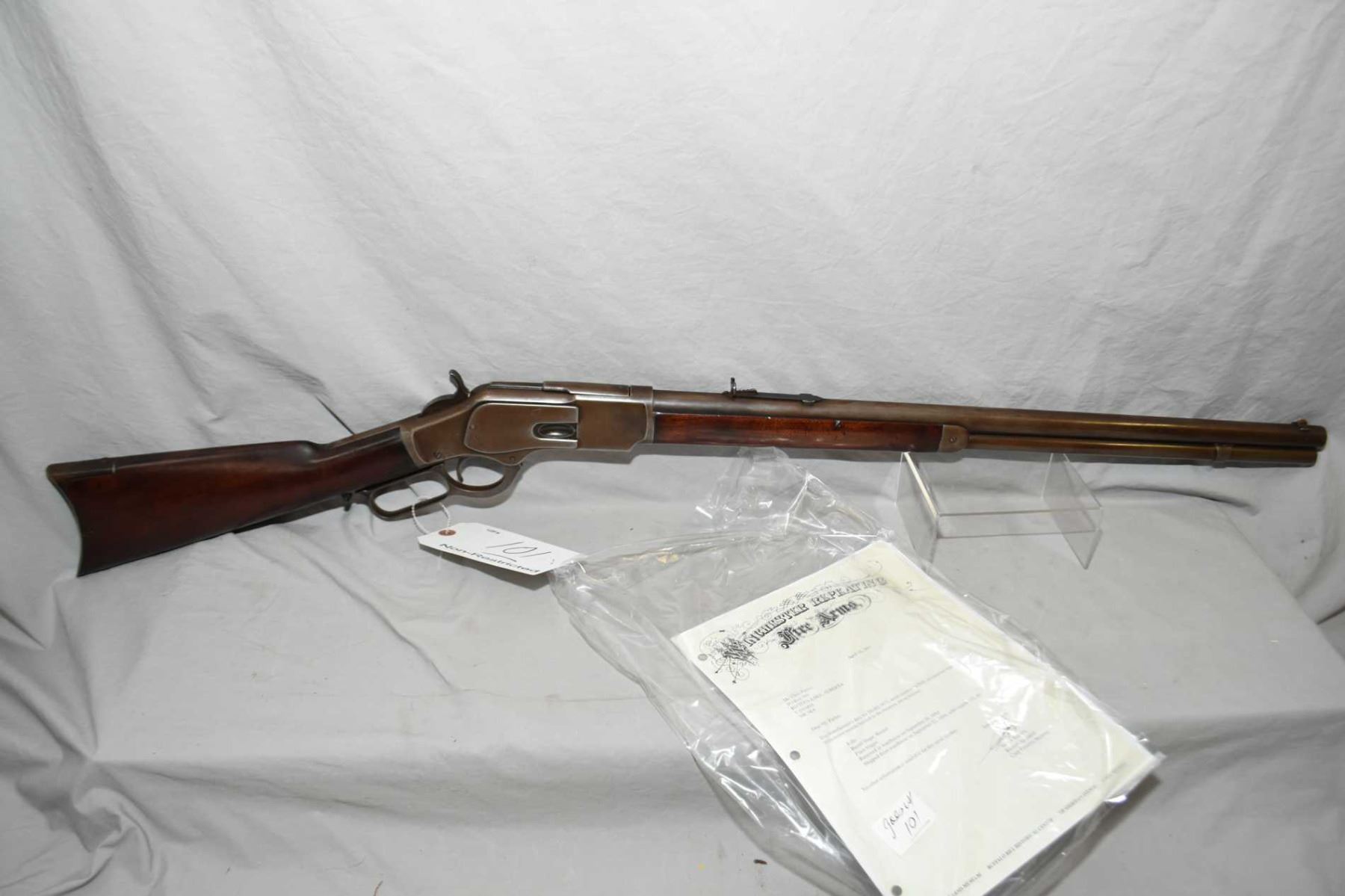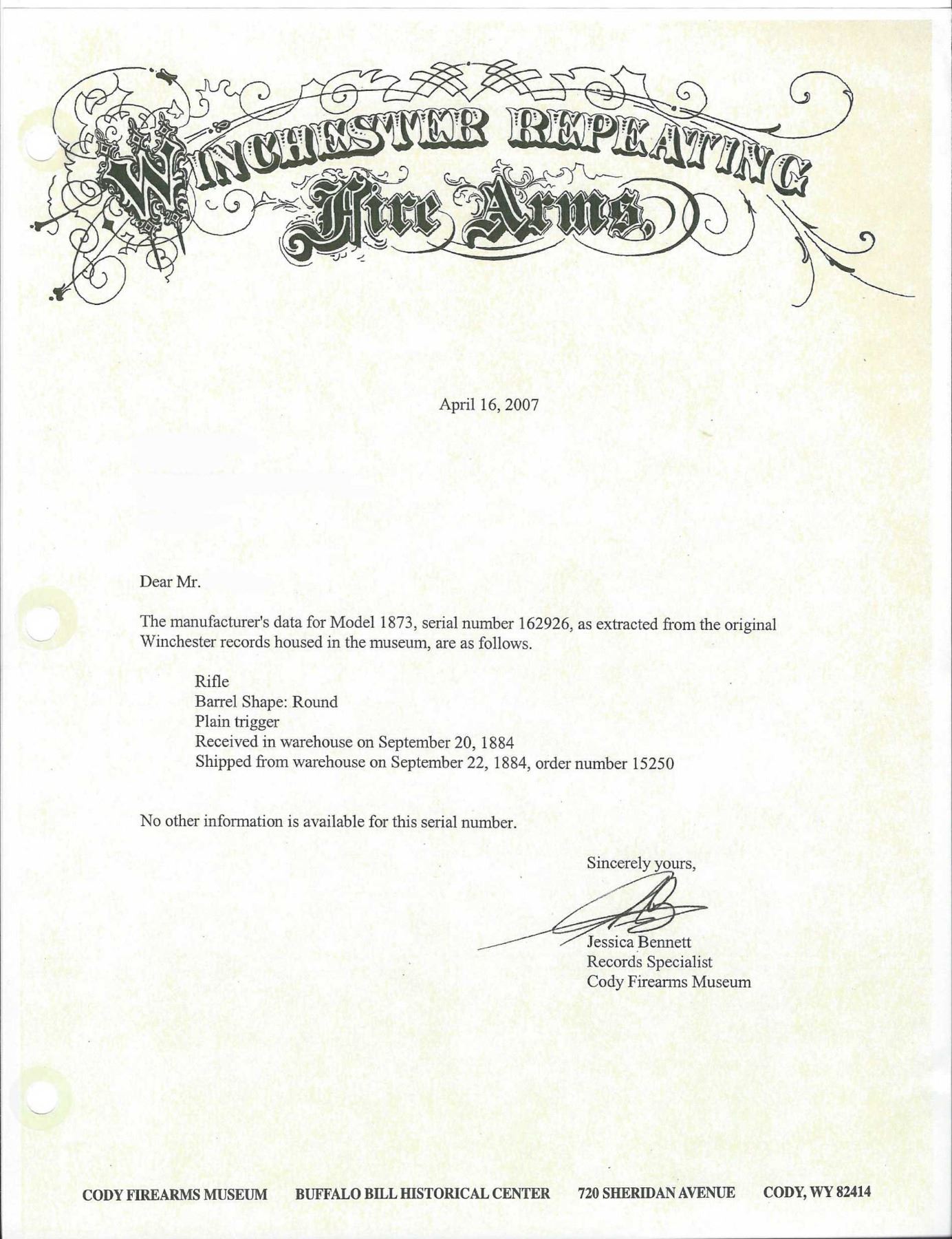 Winchester Model 1873 3 Rd Model .44 - 40 Win Cal Lever Action Rifle w/ 24" rnd bbl full mag [ fading blue finish, barrel sights, good wood with few marks, crescent butt plate with trap, Circa 1884 , c/w Cody Museum Letter Stating Rifle, barrel shaped round, plain trigger, received in warehouse Sept. 20, 1884, shipped from Warehouse Sept. 22, 1884 Order No. 15250 ] Ser # 162926