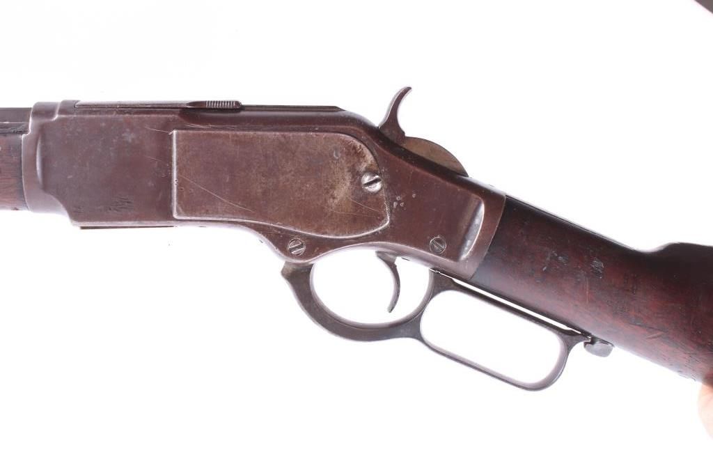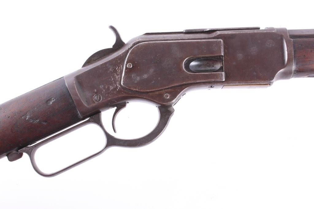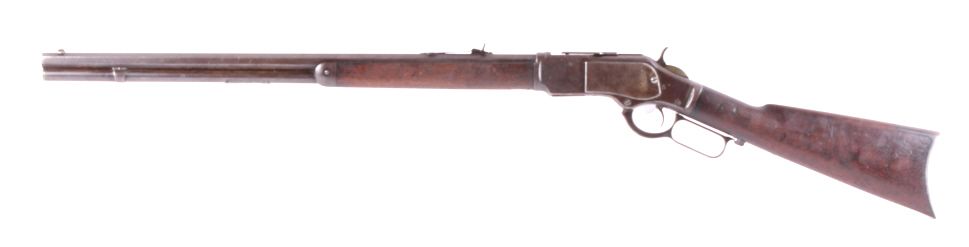 This is a Winchester Model 1873 Third Model lever action repeating rifle in a 38 CF caliber with a full octagon barrel. The rifle has a serial number of 281,***A placing this as manufacture date 1888. One of the mostsuccessful, and certainly one of the most famous Winchester rifles was the Winchester Model 1873. The model 1873 is the true "Gun That Won the West." The gun shows impressive condition and is in the highly desired 38 CFcaliber. The rifle shows original blue coloring and finish on the receiver and barrel with the original wood normal wear. This rifle would have been the first production of the Third Model 1873.
