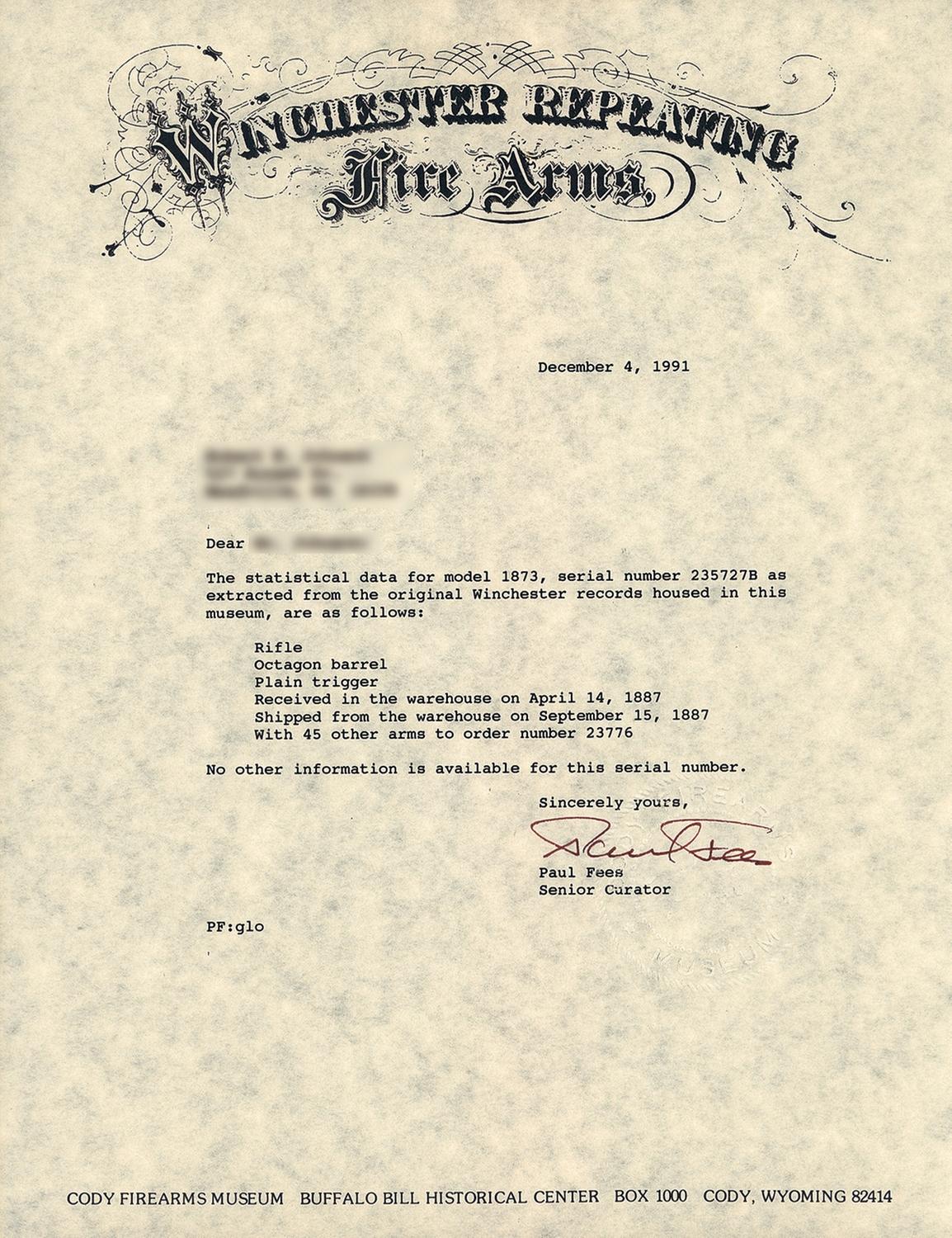 Manufactured in 1887, this particular example is a Third Model with the distinctive integral dust cover rail. The top of the barrel is marked with the two line address/King's patent dates ahead of the rear sight, "44 W.C.F." at the breech and "44 CAL." on the bottom of the brass cartridge elevator. The model designation is marked on the upper tang and the serial number on the lower tang. Replacement ivory blade front and adjustable rear buck horn sights. Full magazine, all blue finish with casehardened hammer and lever, and mounted with a smooth forearm with iron end cap and straight grip stock with a crescent buttplate, with compartment (cleaning rod not included). The accompanying Cody letter verifies the serial number, rifle configuration, octagon barrel, that it was receiver in the warehouse on April 14, 1887 and shipped on September 15, 1887.