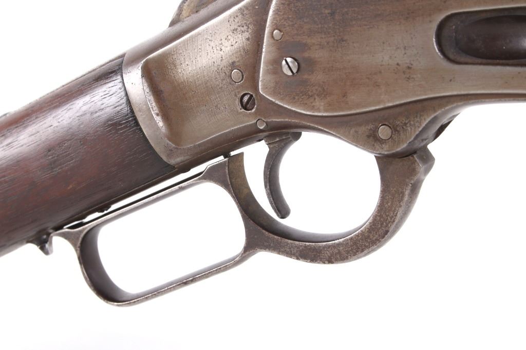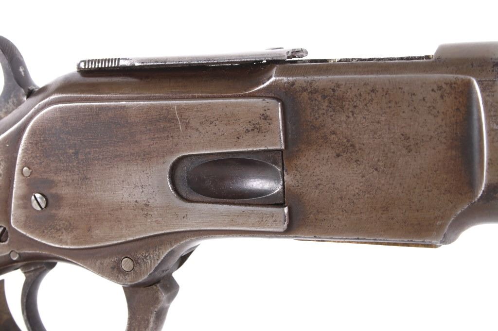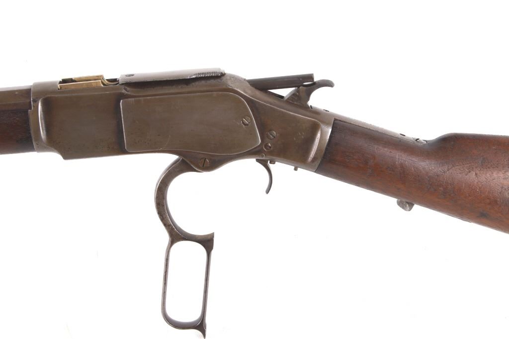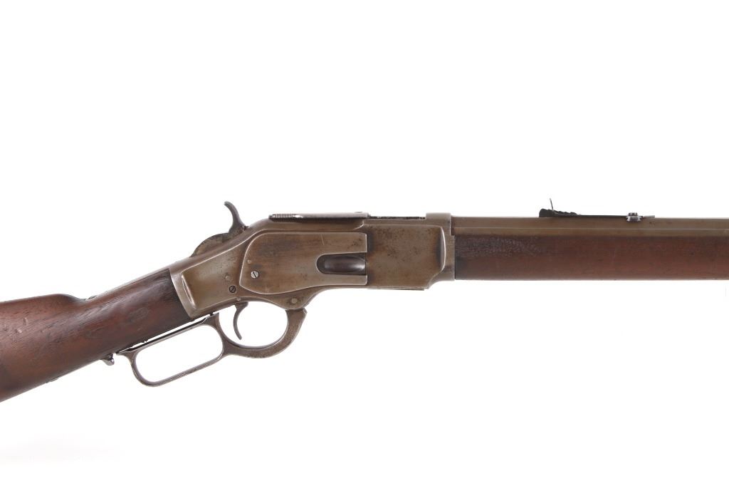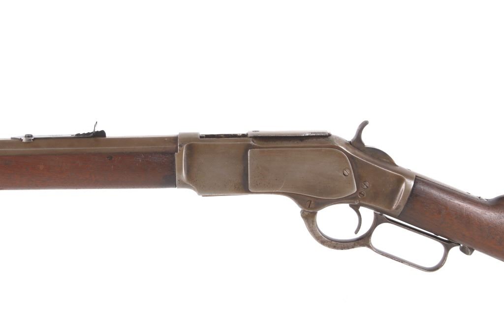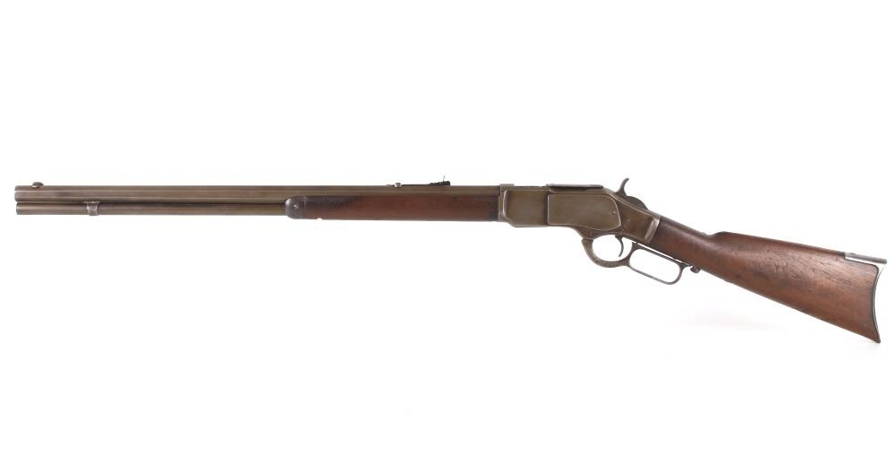 Included in this lot is a Winchester Model 1873 lever action rifle chambered in .44 caliber and manufactured in 1880. This second model is the classic “Gun That Won the West!”. This Winchester displays a 23 1/2" long octagonal barrel with underside magazine tube and warm patina. The all-original wood displays the desirable tight wood-to-metal fitting around the upper and lower tangs, indicating that it has never been sanded or replaced. This rifle has the original steel crescent butt plate. It retains a nice action. The brass lifter on the bottom of the receiver is unpolished and shows an attractive, mellow patina. The lever catch is also intact. This nice, large caliber Model 1873 is in good condition given its early antique age. The buckhorn rear sight and blade front sight are Winchester original and have been on the rifle since it left the Winchester warehouse. This is a nice example of a rifle produced in a factory before the widespread use of electricity, and it is as good and solid today as it was on the day it was made. The Model 1873 was the standard for lever actions throughout the Frontier Period in the West, which in some areas, lasted well into the twentieth century. Most surviving specimens show heavy use and often abuse, with broken or missing parts. Serial Number: 49843. This firearm qualifies as an antique and does not require FFL Transfer or NICS Background Check.