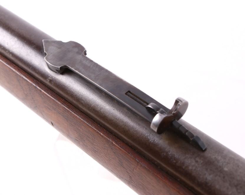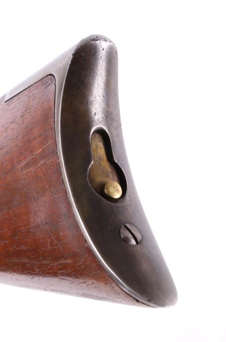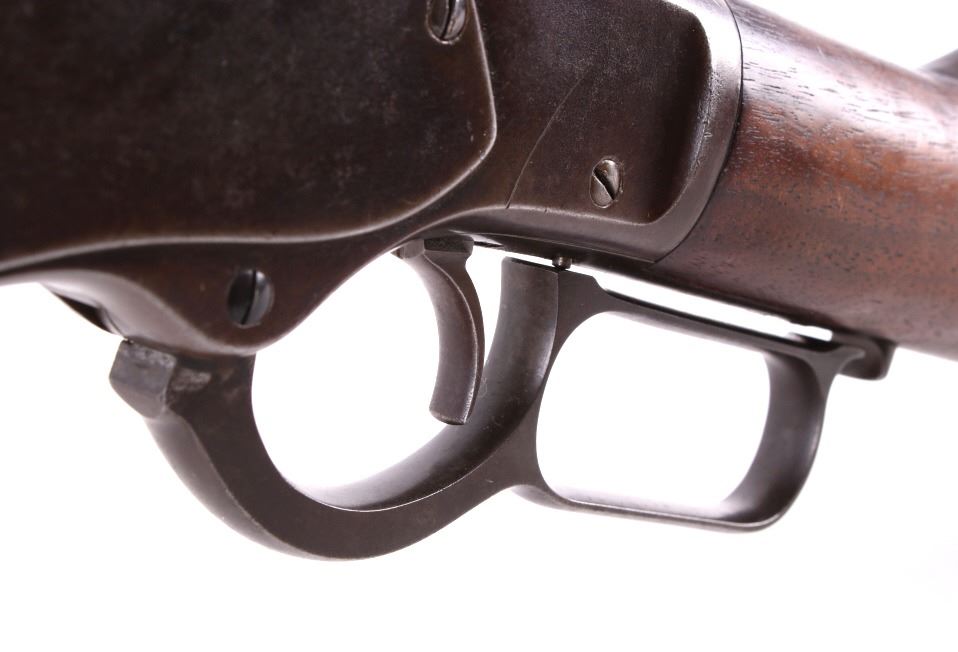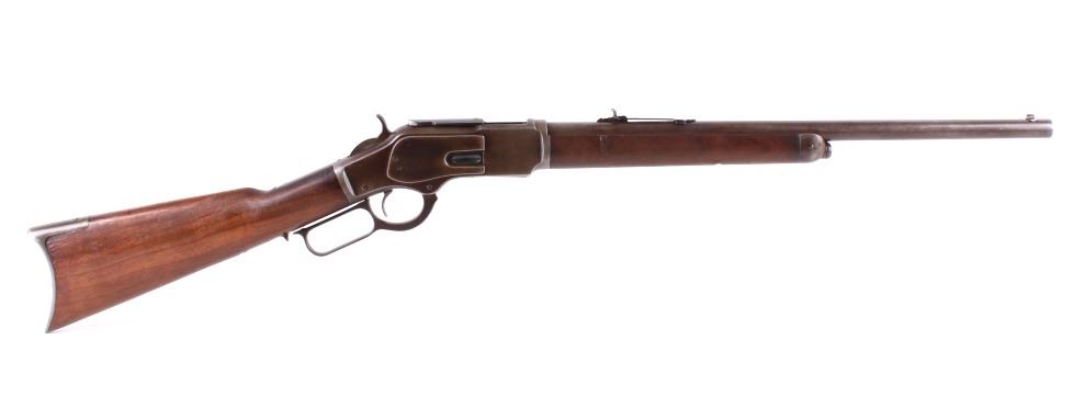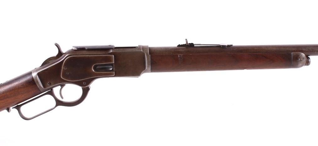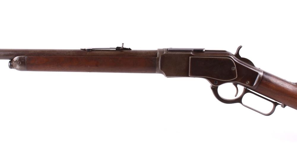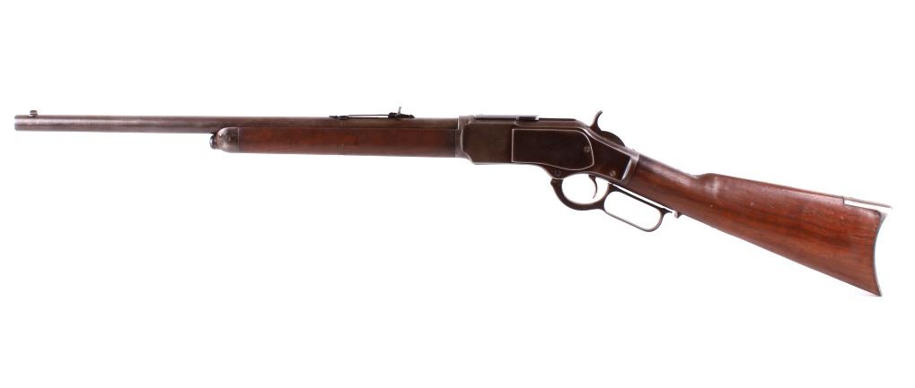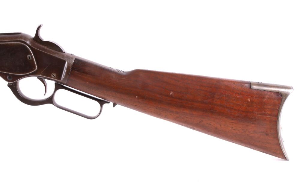 For your consideration is a Winchester Model 1873 lever action rifle, manufactured in 1885. This rifle is marked 38 Cal. on barrel and lower brass plate. Fixed blade front and adjustable rear step sights. The 20" round blue'd barrel is marked "Winchester's-Repeating-Arms New Haven, CT - King's - Improvement - Patented - March 29, 1866. October 16, 1860". Serial number on the lower tang and "MODEL 1873" on the upper tang. Smooth straight grain walnut stock and fore grip are in very good condition. This firearm has a steel button cap on the end of the magazine. The rifle has a steel cresent but plate with a brass butt trap in good condition but has no cleaning rod. Serial Number: 181398B. This firearm qualifies as an Antique, and does not require FFL Transfer or NICS Background Check.