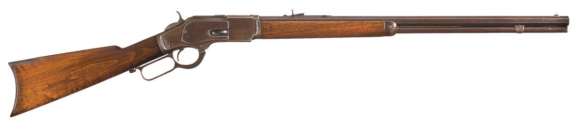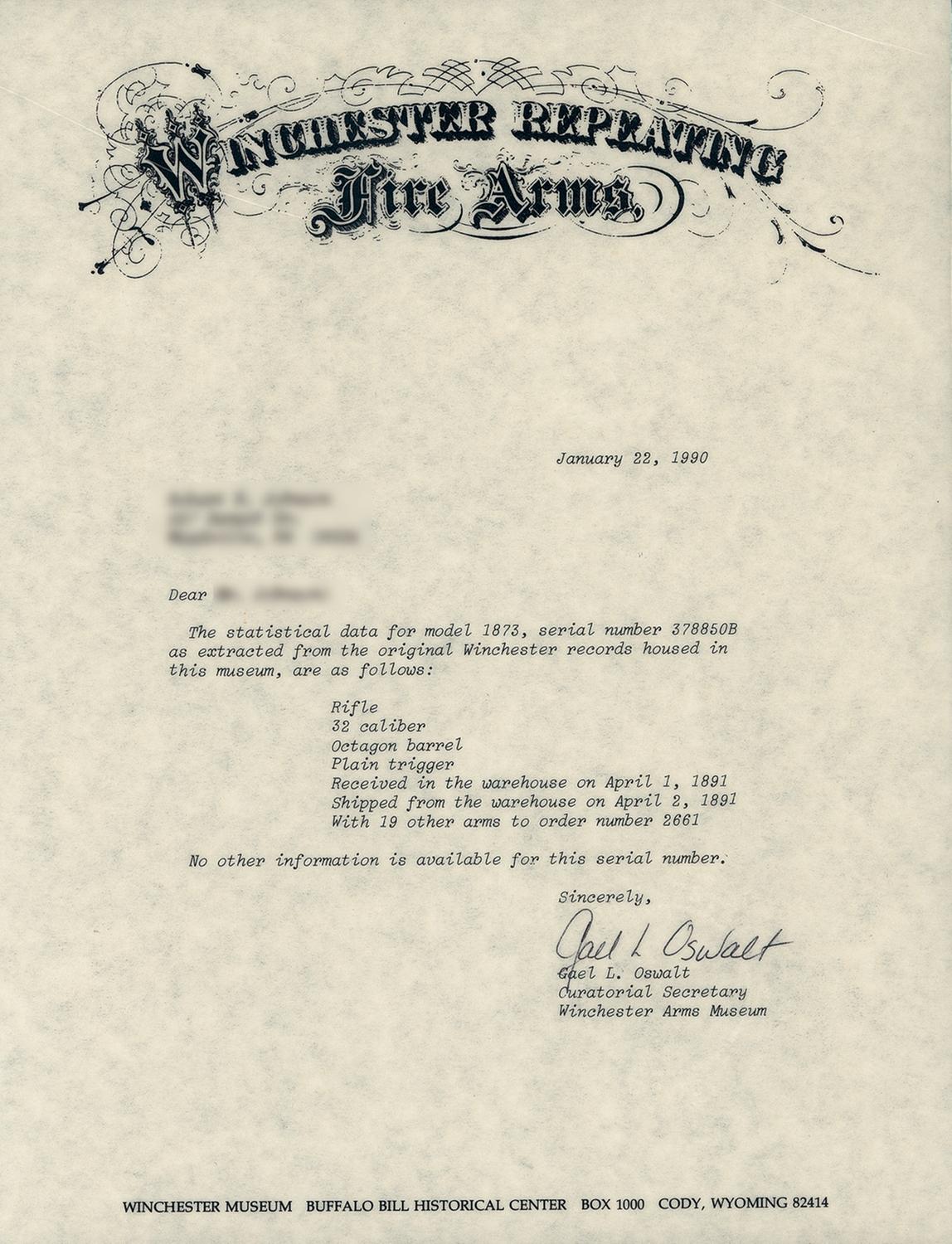 Manufactured in 1891, this particular example is a Third Model with the distinctive integral dust cover rail. The top of the barrel is marked with the two line address/King's improvement patent dates ahead of the rear sight, "32 W.C.F." at the breech and "32 CAL." on the bottom of the brass cartridge elevator. The model designation is marked on the upper tang and the serial number on the lower tang. Standard blade front and adjustable rear buckhorn rear sights. Full magazine, all blue finish with casehardened hammer and lever, and mounted with a smooth forearm with iron end cap and straight grip stock with a crescent buttplate. The accompanying Cody letter verifies the serial number, rifle configuration, caliber, octagon barrel, plain trigger, that it was received in the warehouse on April 1, 1891 and shipped out on April 2, 1891.