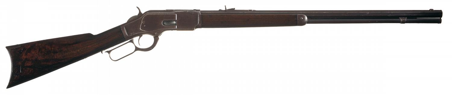 Manufactured in 1903, this particular example is a Third Model with the distinctive integral dust cover rail. Blade front sight is absent and adjustable buckhorn rear sight. The top of the barrel is marked with the two line address/King's Improvement patent dates ahead of the rear sight, and "32 W.C.F." at the breech. The brass elevator is marked "32 CAL". The model designation is marked on the upper tang and the serial number on the lower tang. All blue finish with casehardened hammer and lever, and mounted with a smooth forearm with iron end cap and straight grip stock with a crescent buttplate.