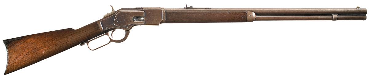 Manufactured in 1888, this particular example is a Third Model with the distinctive integral dust cover rail. The top of the barrel is marked with the two line address/King's patent dates ahead of the rear sight, "38 W.C.F." at the breech and "38 CAL." on the bottom of the brass cartridge elevator. The model designation is marked on the upper tang and the serial number on the lower tang. Silver blade front and adjustable buckhorn rear sights. Full magazine, all blue finish with casehardened hammer and lever, and mounted with a smooth forearm with iron end cap and straight grip stock with a crescent buttplate, with compartment (the door does not slide open).