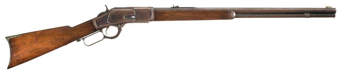 Manufactured in 1888, this Third Model 1873 lever action rifle has the distinctive integral dust cover rail machined to the top of the receiver. Replacement German silver blade front sight with a sporting type rear sight and a full length magazine. The top of the barrel has the two line address/King's patent dates marking and "32 W.C.F." The serial number appears on the lower tang and "MODEL 1873" is on the upper tang, with "32 CAL." on the brass cartridge elevator. The buttplate is marked "DRC / 1003". Smooth walnut forearm and straight grip stock with forend cap and crescent buttplate.