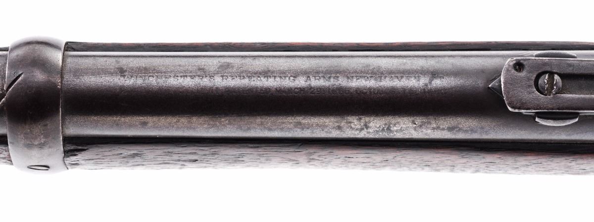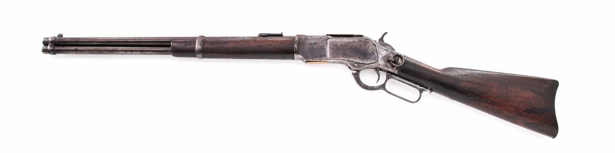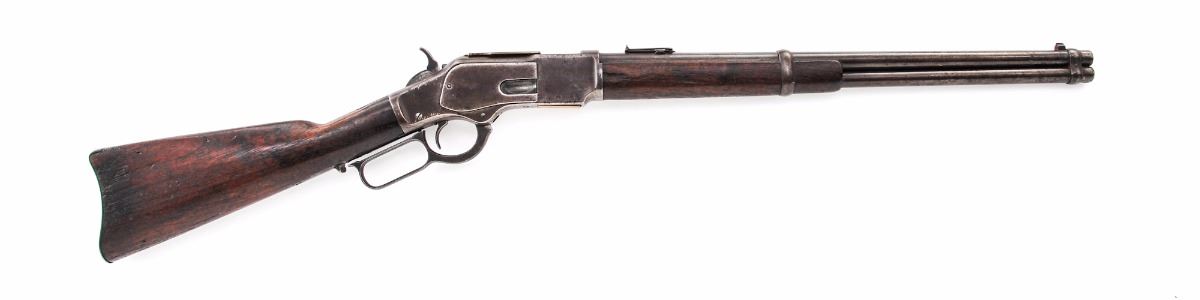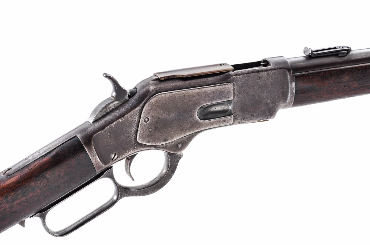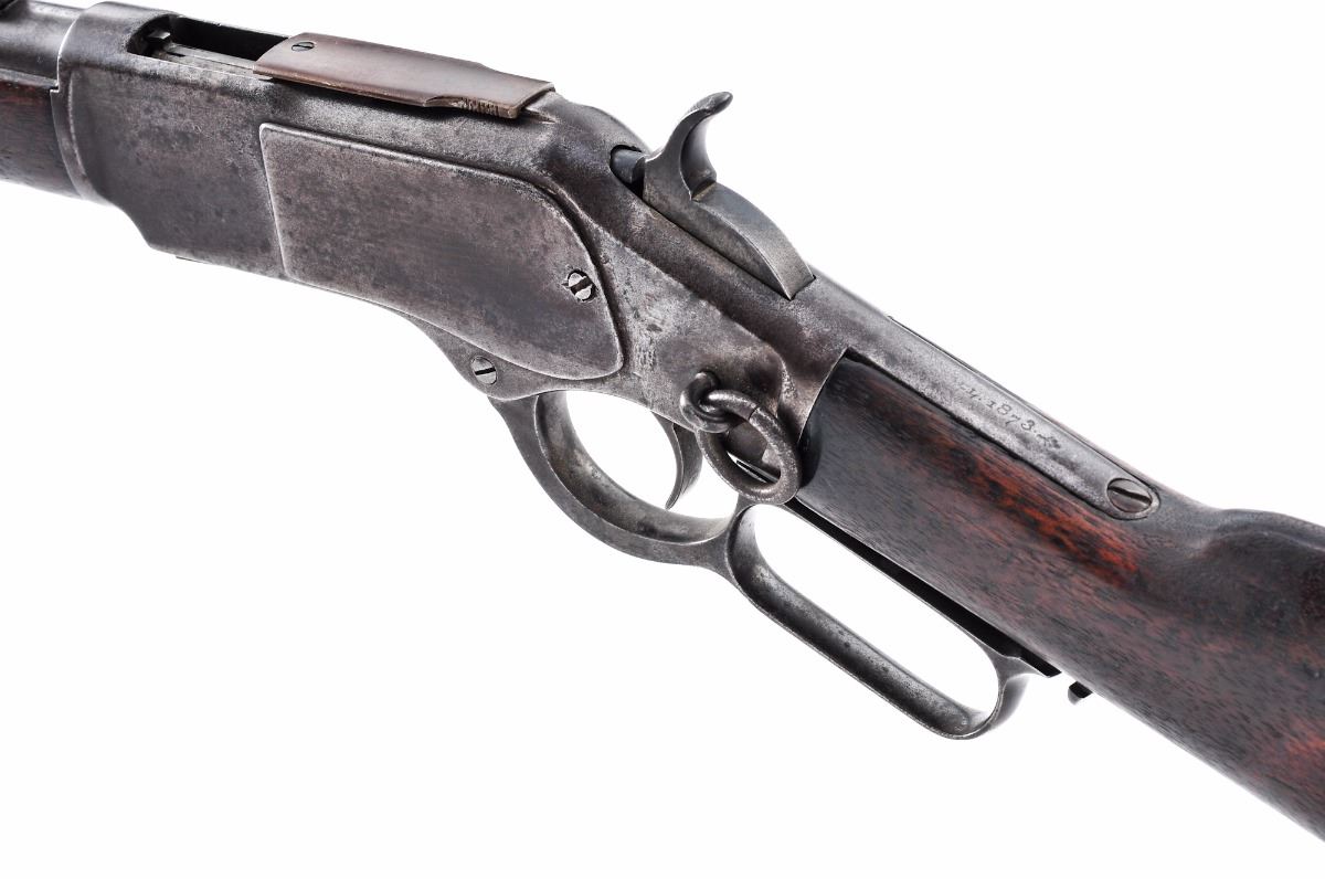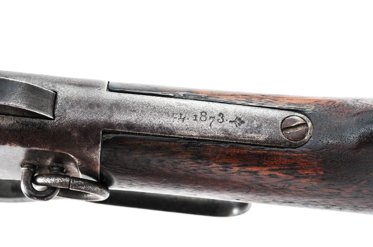 Winchester Model 1873 Lever Action Saddlering Carbine, #529800, .44 WCF cal., 20'' barrel, blue finish, straight walnut stock and forend, steel buttplate, open sights, with dustcover and saddlering. Upper tang marked 1873; lower tang with serial number designation below lever latch. Mfg'd 1899. Condition is fair. Metal surfaces with an overall dark patina, as well as scattered dark spotting. Sideplate screw is well worn. Stock shows signs of age including oil darkening, scratches and mars. Dustcover may be a later replacement, as it does not show equal age to the rest of the rifle. Action and bore are good, bore with moderate corrosion. Est.: $800-$1,200. (C&R)