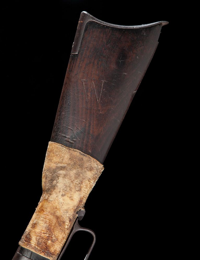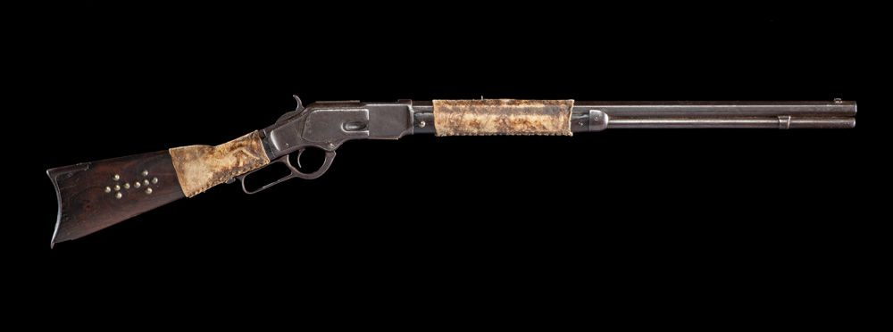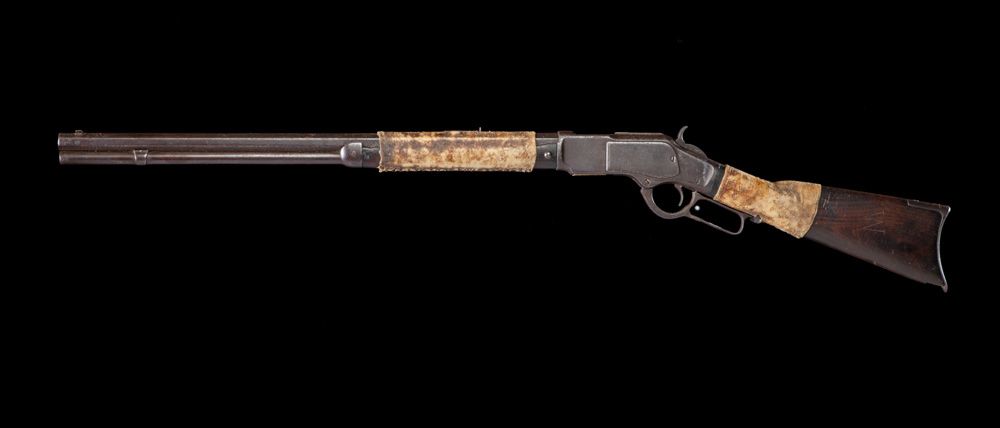 Winchester Model 1873 Rifle. NVSN, appears to be circa 1880s, .44-40 caliber, 24" octagon barrel, rifle style wood, heavy rawhide (buffalo?) repairs on wrist and forearm, tack decoration. The decoration and condition would normally indicate frontier and possibly Native American use, but do appear to be done at a later date for decorative purposes. CONDITION: dark brown patina over all, dark rough bore, rear sight has been fabricated from original sight which was probably broken, no dust cover, chip missing from toe of butt wood, scattered light pitting, mechanically very good. PROVENANCE: Forth Worth Museum of Science and History. Sale to benefit the collections of the Fort Worth Museum of Science and History.