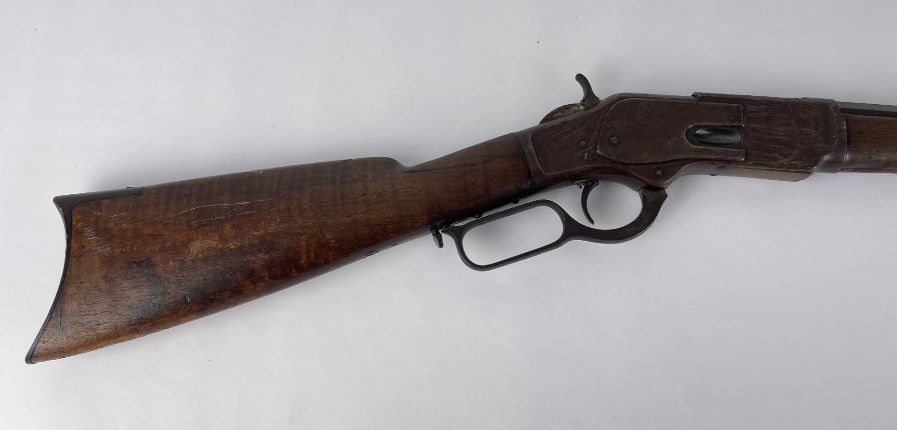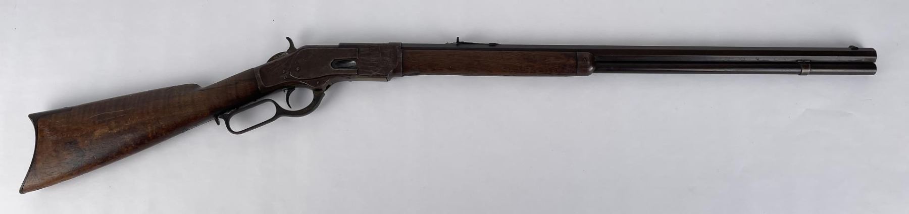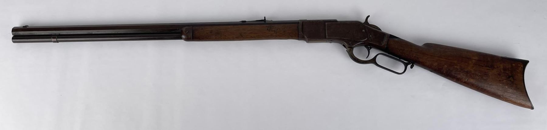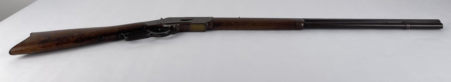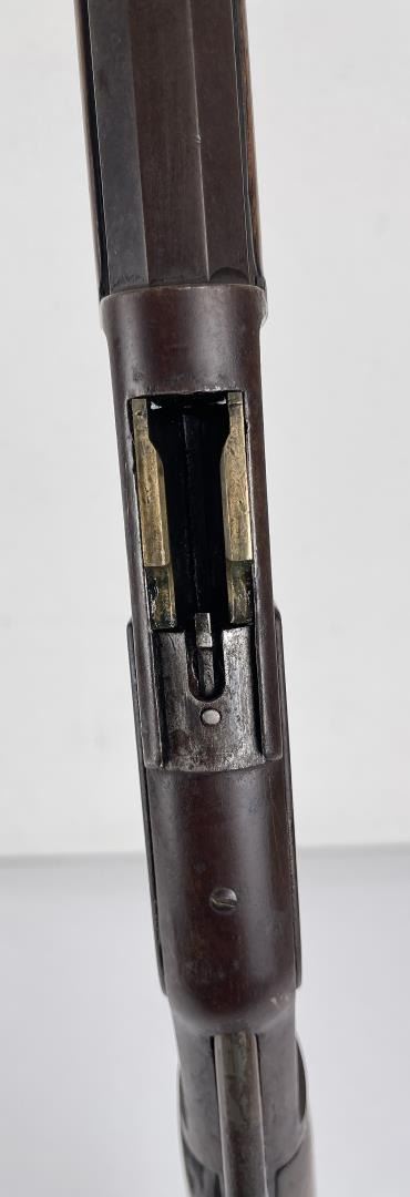 Made in 1875. Caliber marking is not present on brass extractor. Top dust cover is correct to the rifle but is easily dislodged as the stopper pin holding it has worn down. When ejecting the cartridge the extractor will not grab the dust cover. Nice all original rifle. Does not require FFL.