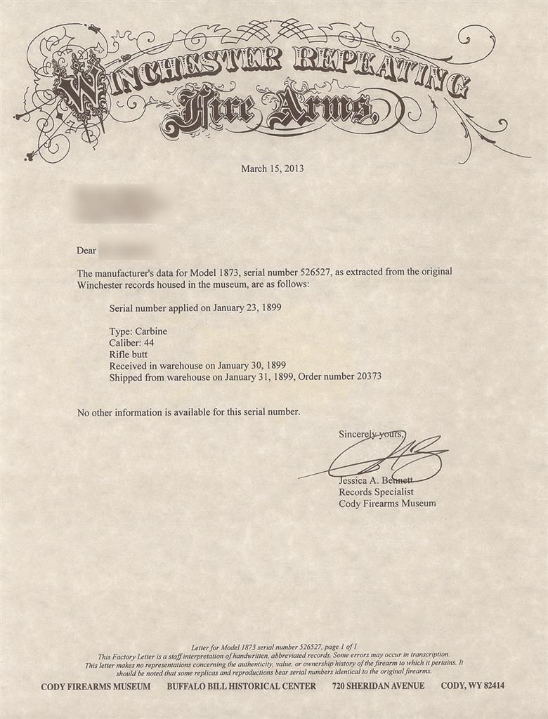 Manufactured in 1899. With factory letter stating it was shipped on January 31, 1899, order number 20373 and confirms carbine configuration, caliber and rifle butt.