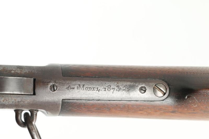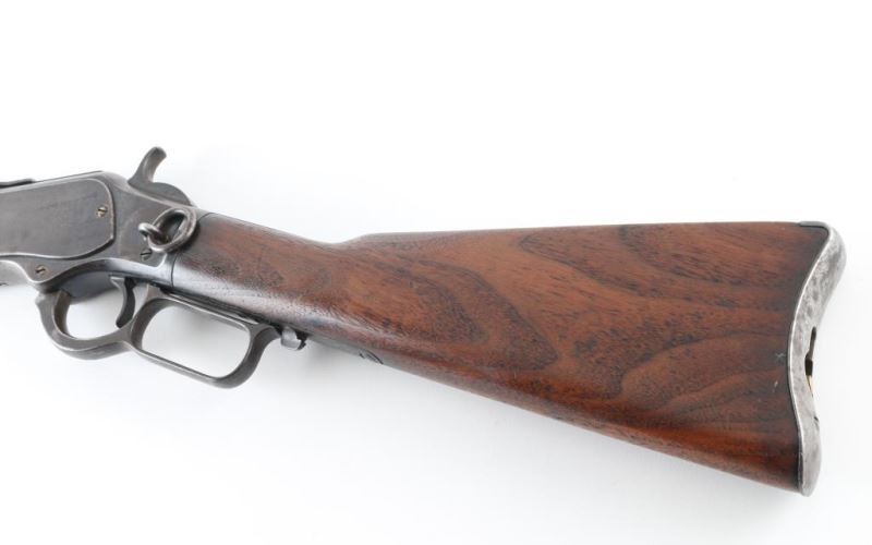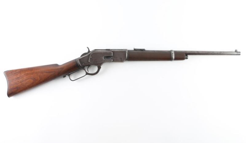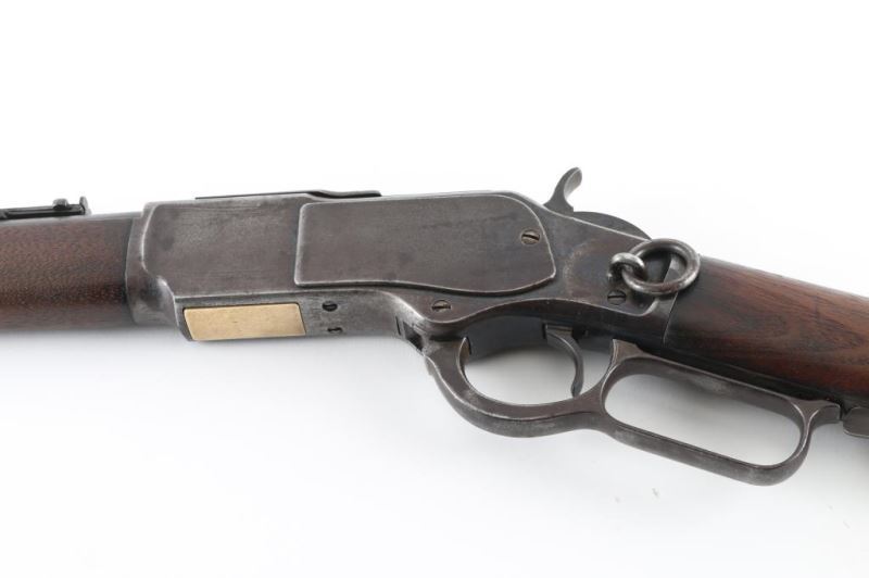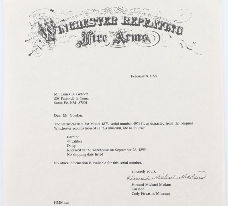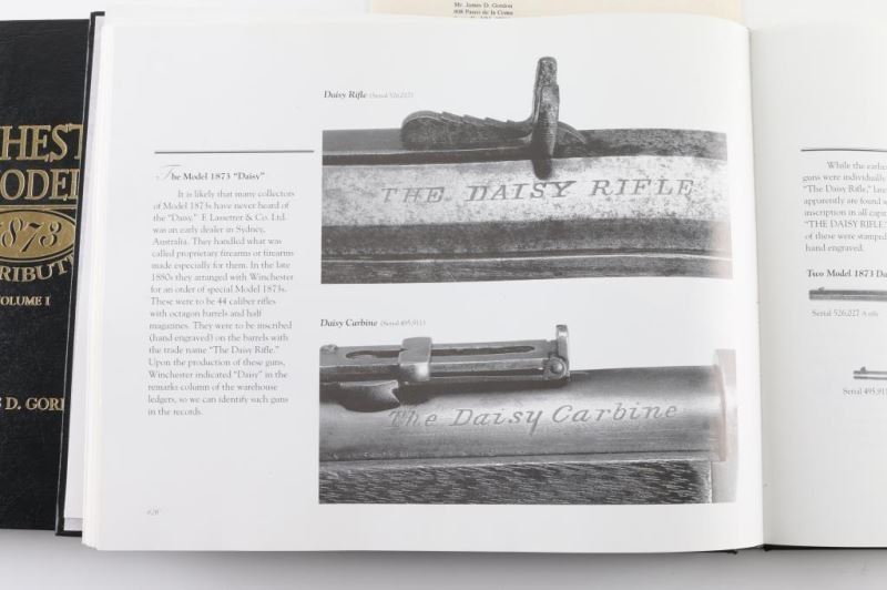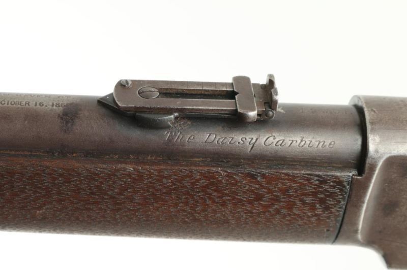 .44-40 Win SN: 495911 Special Order lever action carbine marked "The Daisy Carbine" on left side of the barrel over the chamber. This was a special order carbine for Australian dealer F. Lassetter & Co of Sydney. This carbine is pictured and referenced by serial number on p476-477 of James D Gordon's book "Winchester's New Model of 1873 - A Tribute (Volume II)". The book states that this is the only known remaining carbine, and all "Daisy" rifles and carbines are recorded in Winchester factory records. Included letter from Cody Firearms Museum does reference "Daisy". The two volume set by Gordon is also included with this carbine, manufactured circa 1895. Features 19" round barrel, half magazine, blade front & ladder rear sights, sliding dust cover, lever lock, butt trap with sliding door, straight wristed smooth walnut stock, walnut forend, saddle ring, carbine buttplate. Bore is fair condition, a bit dark, lightly pitted throughout, with good rifling. Metal surfaces are a medium brownish gray, mottled on barrel, traces of original blue in protected areas. Markings are generally sharp and readable, with exception of caliber marking on bottom of brass cartridge lifter being mostly eroded. Wood is good condition, some oil staining where wood meets metal, with fair fit to metal, some evidence of previous sanding (slight shrinkage or loss at tangs and at toe). Includes letter and two volume book set as mentioned above. Condition is NRA Very Good *** Antique Firearm *** [From the Jim Sigmon Collection]