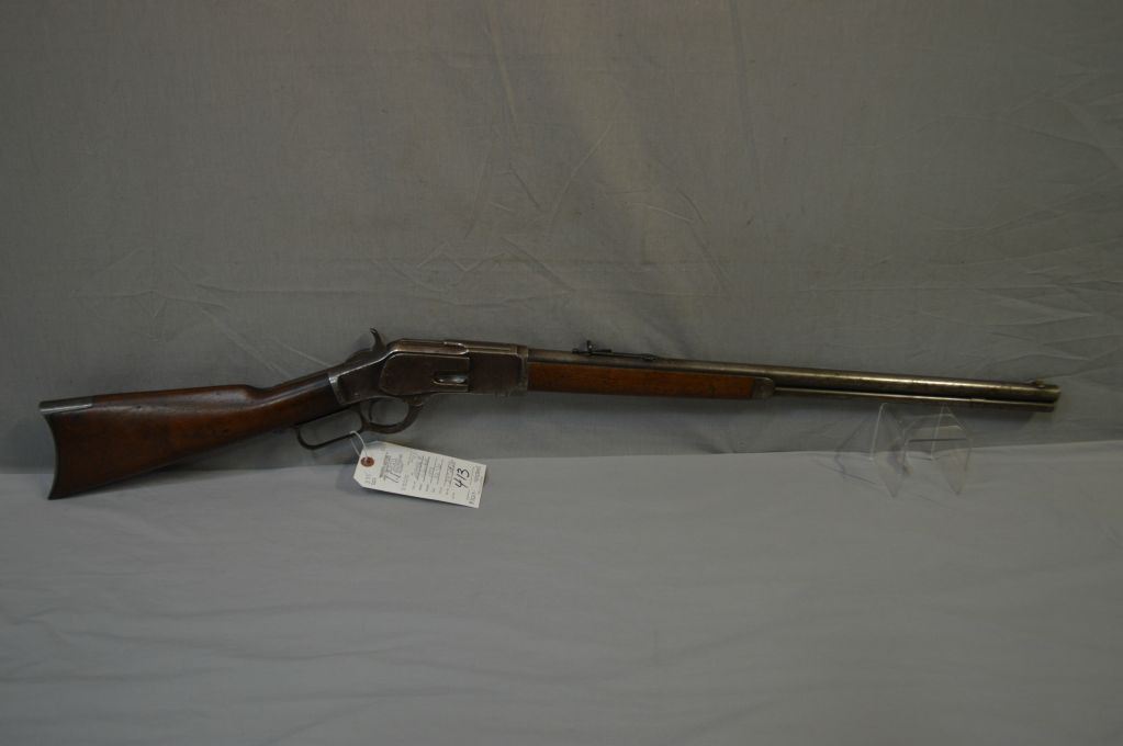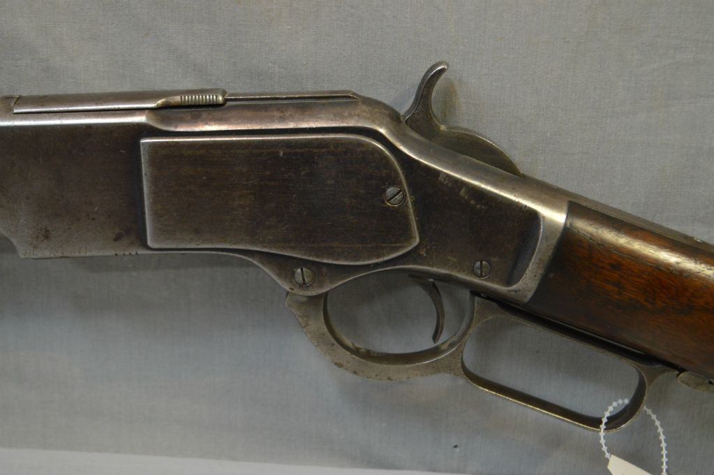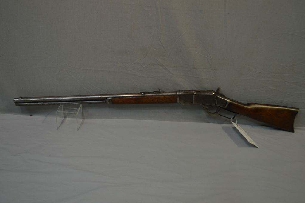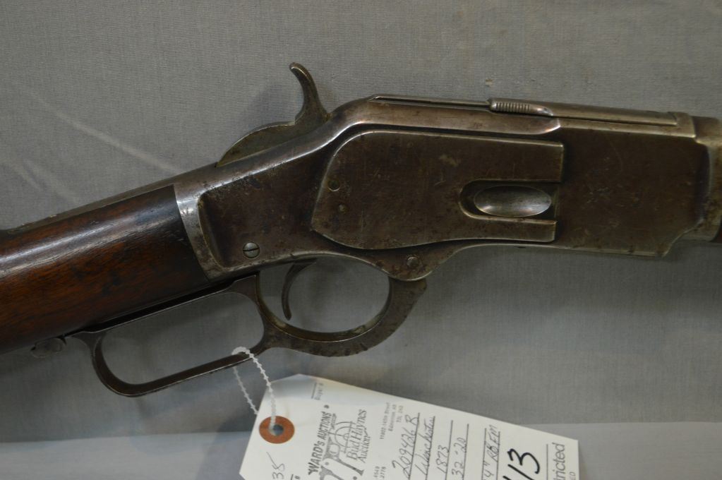 Winchester Model 1873 Third Model .32 - 20 Cal Lever Action Round Barrel Full Mag Rifle w/ 24" bbl [ fading blue finish turning brown in some areas, more in carry areas, barrel sights, has dust cover on integral rail, with center screw, missing one tang screw, some patchy pitted spots mostly to right side of frame, forewood appears good, butt stock has slight chips by toe, crescent butt plate, functions well, Circa 1886 ] Ser # 209426B
