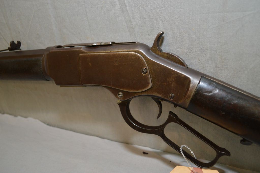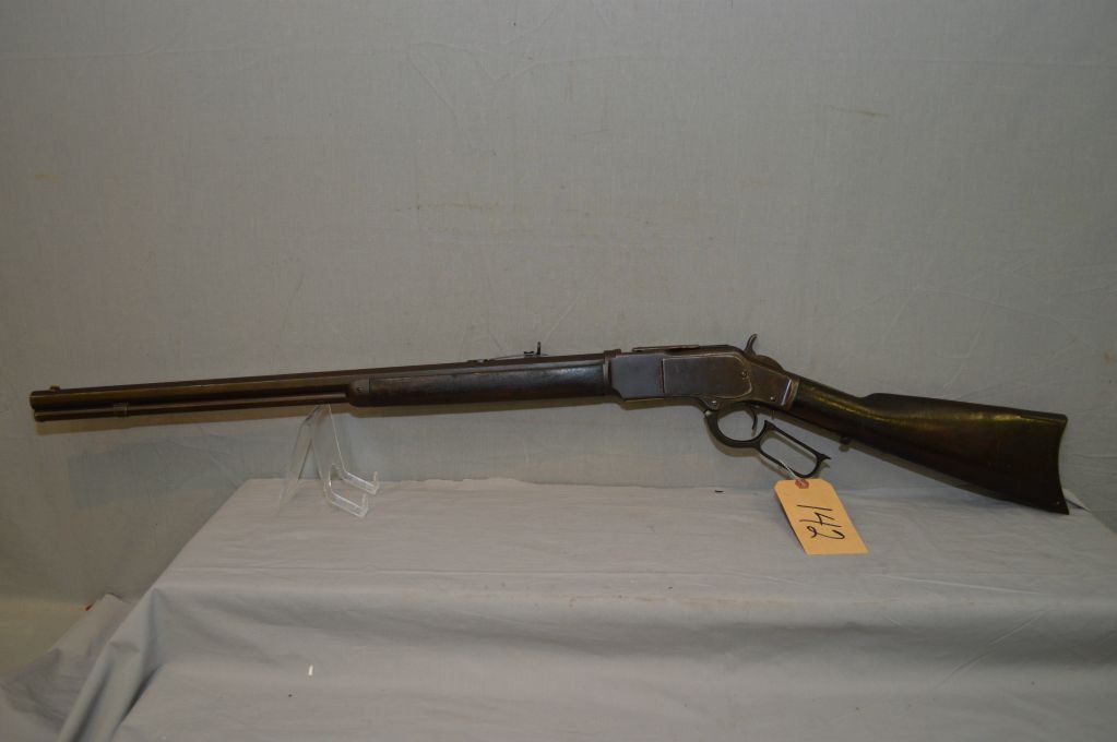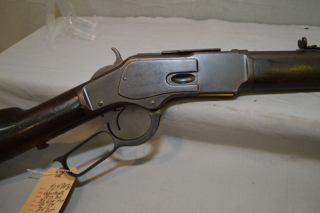 Winchester Model 1873 Third Model .32 WCF cal Lever Action Rifle w/ octagon bbl full mag ( bbl & mag trimmed to approx 24" ) [ blue finish turned brown, barrel sights, fair wood , Circa 1891 ] Ser # 404847B