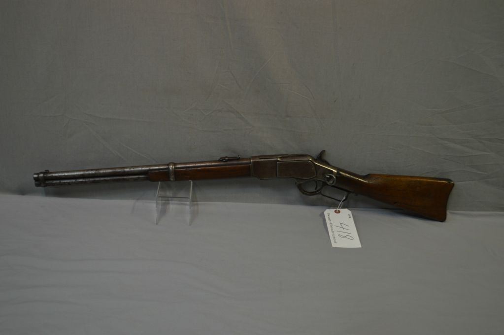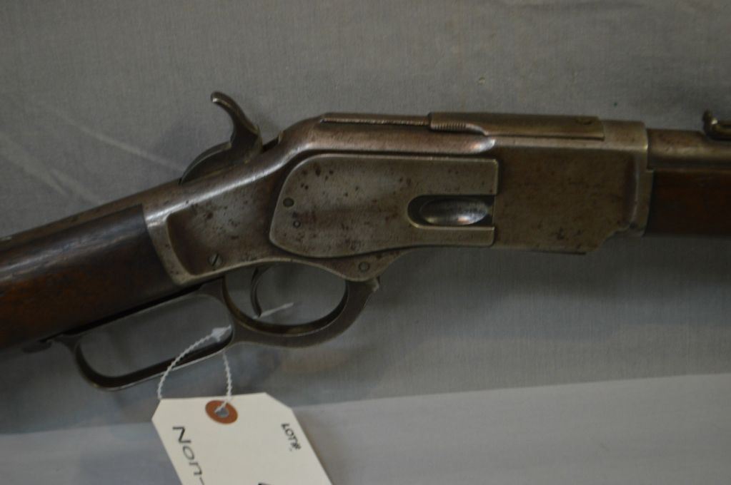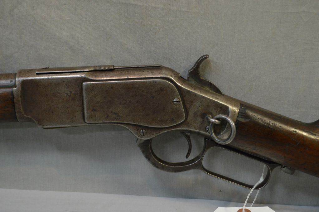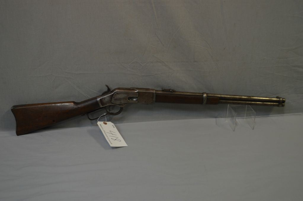 Winchester Model 1873 Third Model .44 WCF Cal Lever Action Saddle Ring Carbine w/ 20" round bbl full mag [ fading blue finish, turned brown in protected areas with some pitting, barrel sights, has dust cover on integral rail with center screw, good forend with few marks & wear etc., butt stock has hole drilled thru and some filing, where there was a sling ring ?, metal carbine butt plate with brass trap cover, Circa 1890 ] Ser # 350541