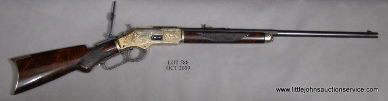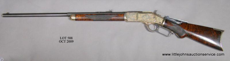 Winchester Model 1873 engraved lever action rifle,  .38 WCF cal., 24” half round/half octagon barrel,  blue and gold finish, set trigger, deluxe  checkered wood stocks, #129339. This gun is in  overall fine condition as refinished, possibly bythe factory. The barrel shows approx. 98% of its  restored blue finish, the frame shows approx. 95%  of its gold refinish, the engraving is beautifully  period accomplished and sharp with a panel scene  of an elk on the left side of the receiver; thelever and hammer are case hardened and the butt  plate is also gold plating and engraved as is the  forend cap. The dust cover is blued and also  engraved; a four piece cleaning rod is contained  in the butt trap and there is a blued unmarkedrear tang sight with adjustable round eye piece;  the wood is beautifully checkered and grained and  in overall very good to fine condition showing  only scattered light scratches and mars due to  storage. A factory letter accompanies this deluxerifle and confirms rifle, 38 caliber, half octagon  barrel, set trigger, special stock, case  hardened, engraved $2.50, received in the  warehouse on July 17, 1883 and shipped from the  warehouse on July 18, 1883. Note: set trigger
