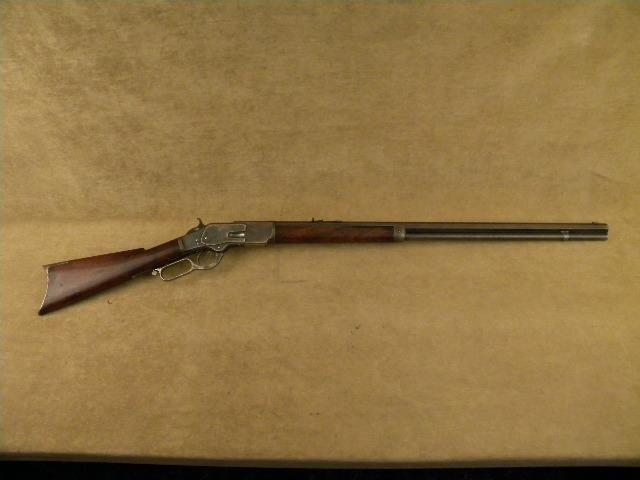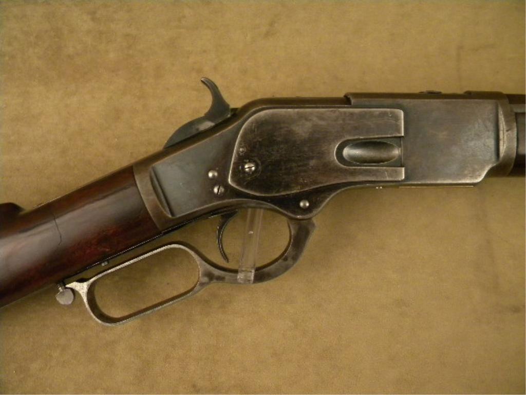Winchester Model 1873 lever action first model rifle, 44-40 cal., 28” octagon barrel, set trigger, with desirable raised thumbprint dust cover, #2295, received in the warehouse Sept. 25, 1874, shipped on the same day, with copy offactory letter. The rifle retains a pleasing 50%-70% original blue overall evenly drifting to patina with some scattered light erosion and normal aging just starting and some evidence of bright original blue; the markings are sharp, theedges are crisp, the stocks show an excellent repair and small restorations with a light re-application of varnish, good wood-to-metal fit; the hammer and lever show considerable original case hardening, the sights are original, the dustcover and loading gate show traces of bright original blue, the action is tight, the bore is near excellent. The longer than standard barrel and set trigger are unusual in the early ‘73s and raised thumbprint dust cover models are rarelyfound with any condition or special features whatsoever. Est.: $10,000-$20,000.