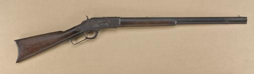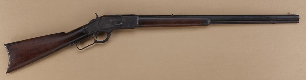 Winchester Model 1873 lever action rifle, .32 WCF cal., 24” octagon barrel, blue finish, wood stocks, #315492B. This gun is in overall good condition showing a heavy dark patina on metal surfaces with scattered areas oferosion and some pitting and knackering around replaced rear sight (front sight also an older replacement), good action, bore and markings; wood is overall good with some scattered mars and scratches from carry andstorage with a couple old losses at the front right side of the butt stock. This gun is untouched and may clean-up considerably with a little careful cleaning and TLC. Est.: $600-$1,200.
