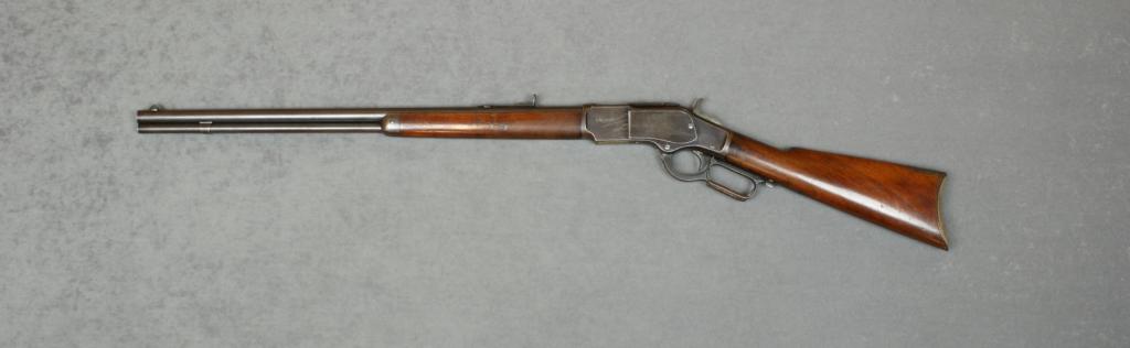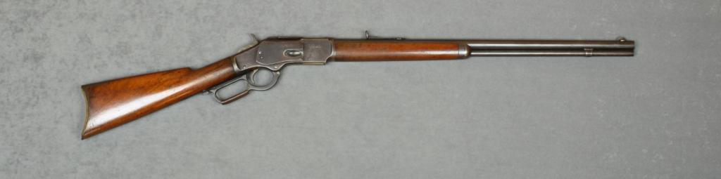 Winchester Model 1873 lever action rifle, .32 WCF cal., 24” round barrel, wood stocks, #310654B. This gun is in overall very good + condition showing original blue in protected areas and the balance of the gun gone to aplum patina with some scattered spots of erosion; very good bore, crisp action, very good markings and wood with some scattered old mars and scratches from carry and storage and three separate stampings of “V.R. Gray”, two on the stocks and one on the left side of the receiver. Est.: $1,750-$3,500.