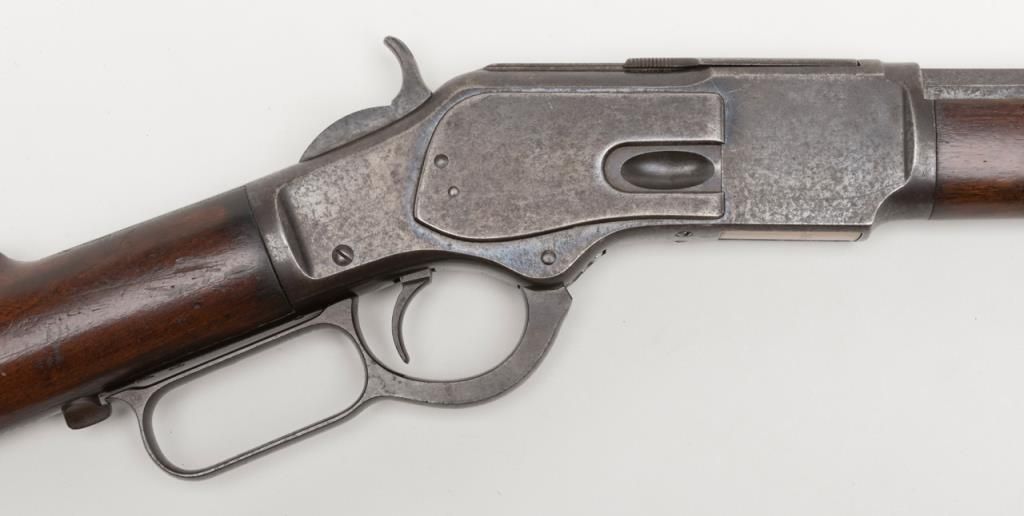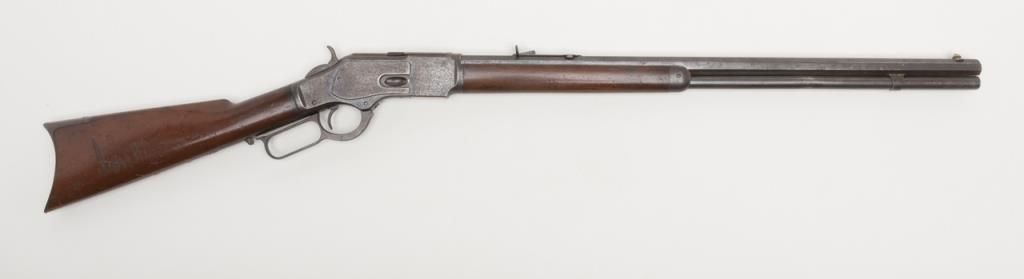 Winchester Model 1873 lever action rifle, .38 W.C.F. cal., 24” octagon barrel, plain trigger, blue finish, wood stocks, 251109 with factory letter confirming caliber, barrel shape and trigger with receipt in warehouse date of Oct. 17, 1887 and shipment date from warehouse of Oct. 19, 1887 to order #543. This ’73 is in overall very good condition showing considerable original blue finish with scattered areas of erosion and general pinprick pitting, very good bore, crisp action,very good markings and very good wood with scattered old mars and scratches including several moderate ones on the butt stock. From the estate of Joe Kiser. (Antique). Est.: $1,500-$3,000.