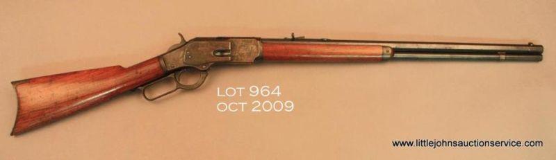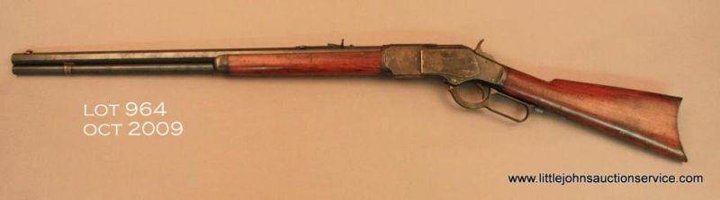 Winchester Model 1873 lever action rifle, .38 WCF cal., 24” octagon barrel, blue finish, plain wood stocks, #675122B. This gun is in overall very good condition showing approx. 70% original muted blue finish with some areas of bright blue; crispaction, sharp markings, bright bore, full magazine, very good wood with scattered storage nicks and mars. This particular Winchester should improve with a careful cleaning. Est.: $2,750-$4,750.