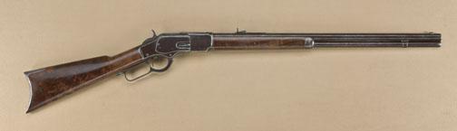 Winchester Model 1873 lever action rifle, .38 WCF cal., 24” octagon barrel, blue finish, wood stocks, #305206B. Factory letter indicates “Rifle; caliber: 38; Octagon barrel; plain trigger; received in warehouseon Sept. 13, 1889 and shipped the same day to order number 2098”. This gun is in overall good condition showing an even brown patina to metal surfaces with some spots of scattered erosion and pin prick pitting; good action and markings; fair but worn bore; gun has been expertly restocked with nicely grained wood showing scattered wear and some nicks and mars from storage; missing rear loading tube follower. Est.: $900-$1,800.