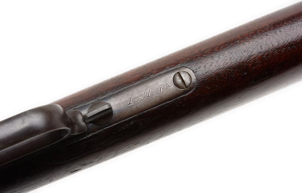 Winchester Model 1873 lever action rifle, .38 caliber, 24” half round/half octagon barrel, S/N 133147A, blued finish, wood stocks in overall very good + condition showing a brown patina to barrel assembly with traces of original blue in protected areas and considerable original blue on the receiver; very good + bore, crisp action, sharp markings and very good wood stocks with some scattered mars from carry and storage plus some oil staining to rear portion of butt stock. Est.: $1,500-$3,000.