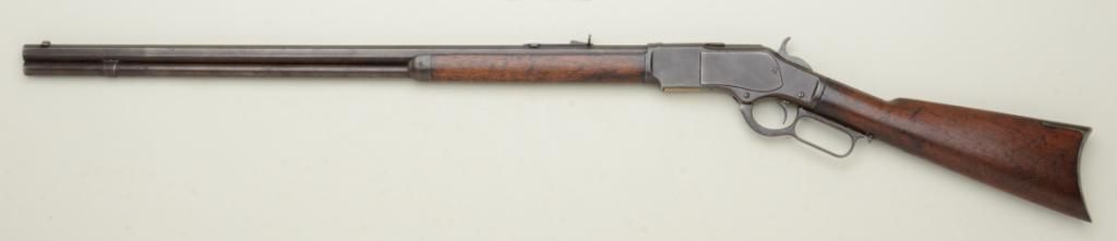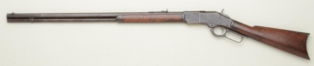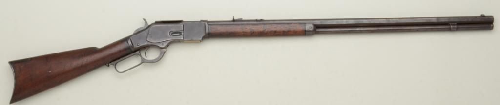 Winchester Model 1873 lever action rifle 3rd Model, .38-40 cal., 28" octagon barrel, full magazine, crescent butt, #26655B. The rifle shows a dark brown patina, some light to moderate erosion and pitting, even wear, good markings; the stocks are good with normal aging, some small areas of wood fill on the forend, small losses at the edges and frontier wear; the action is working, there is a slight bulge in the barrel 6" from themuzzle and the bore is fair. Confirmed by factory letter. Est.: $1,250-$2,500