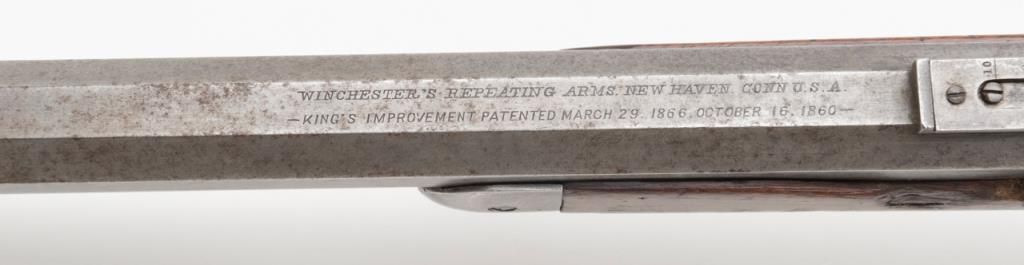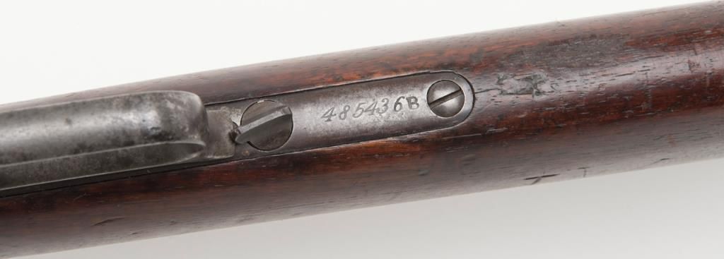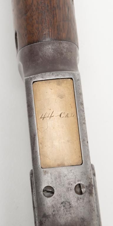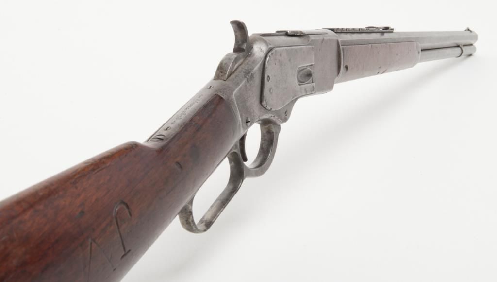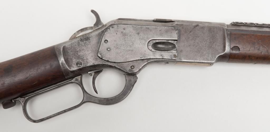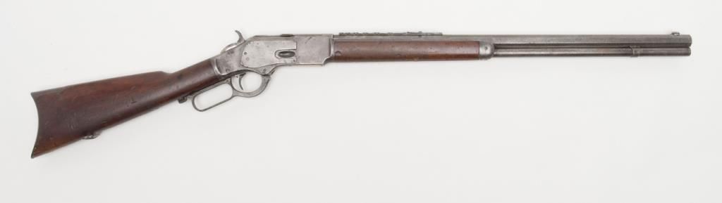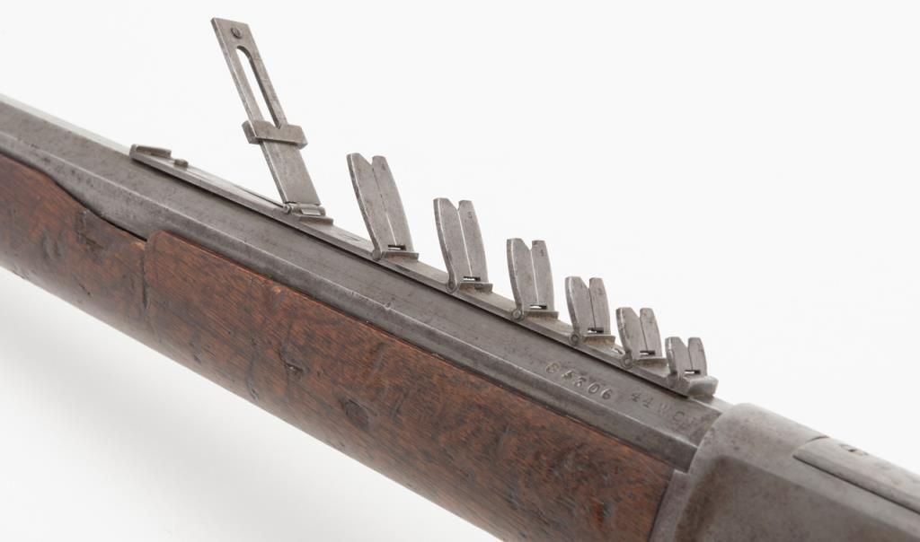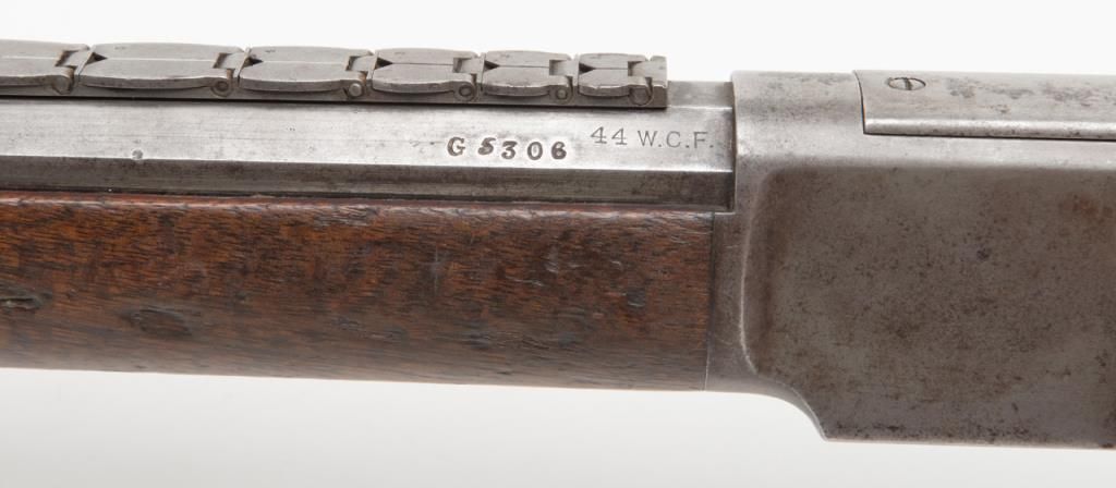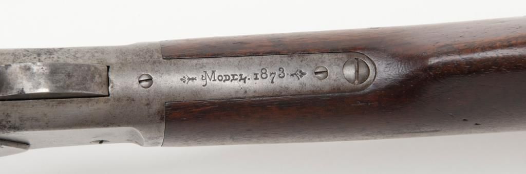 Winchester Model 1873 lever action rifle, .44 W.C.F. cal., 24” octagon barrel, blue finish, 7-leaf rear sight, set trigger, sling swivel on the butt stock, #485436B in overall very good condition showing an overall grey patina on metalsurfaces with some scattered spots of erosion and several minor spots of old pitting on the left side plate and a spot on the rear left and a spot on the rear right sides of the frame; very good bore, crisp action, very good markings including“G5306” stamped in front of the caliber marking on the left barrel flat at the breech (likely a registration number for acceptance into Canada or South Africa but no other foreign proofs, etc. visible); set trigger working at time ofdescription, front swivel at forend cap missing; stocks are overall good with scattered old mars, dings and scratches from carry and storage plus an old 1-1/2” loss along the left top rail of the forend, a “JV” carved into the right side of thebutt stock and an old small circular plug of wood approx. 3/8” in diameter located in the bottom of the butt stock near the butt plate that appears to have neatly repaired an old small crack in the wood at that location. Also accompanying this