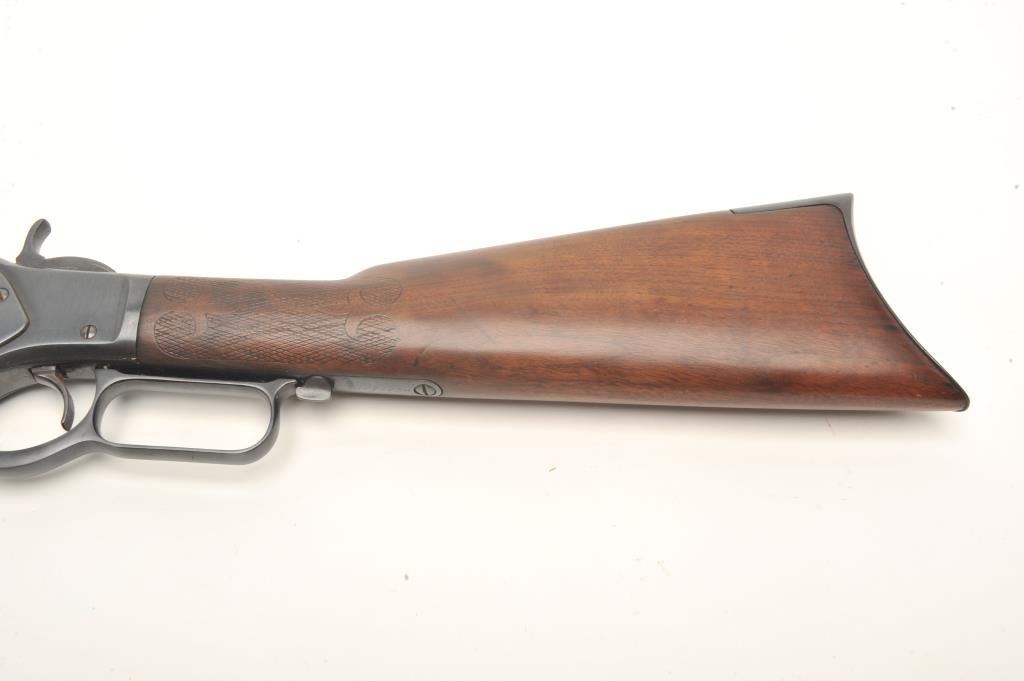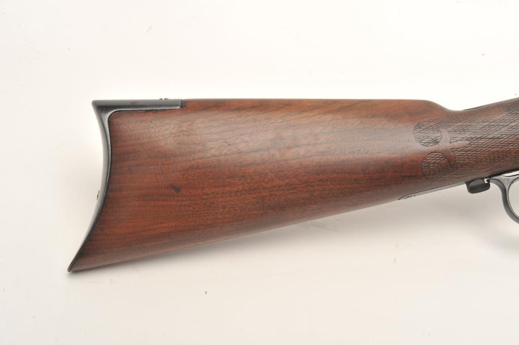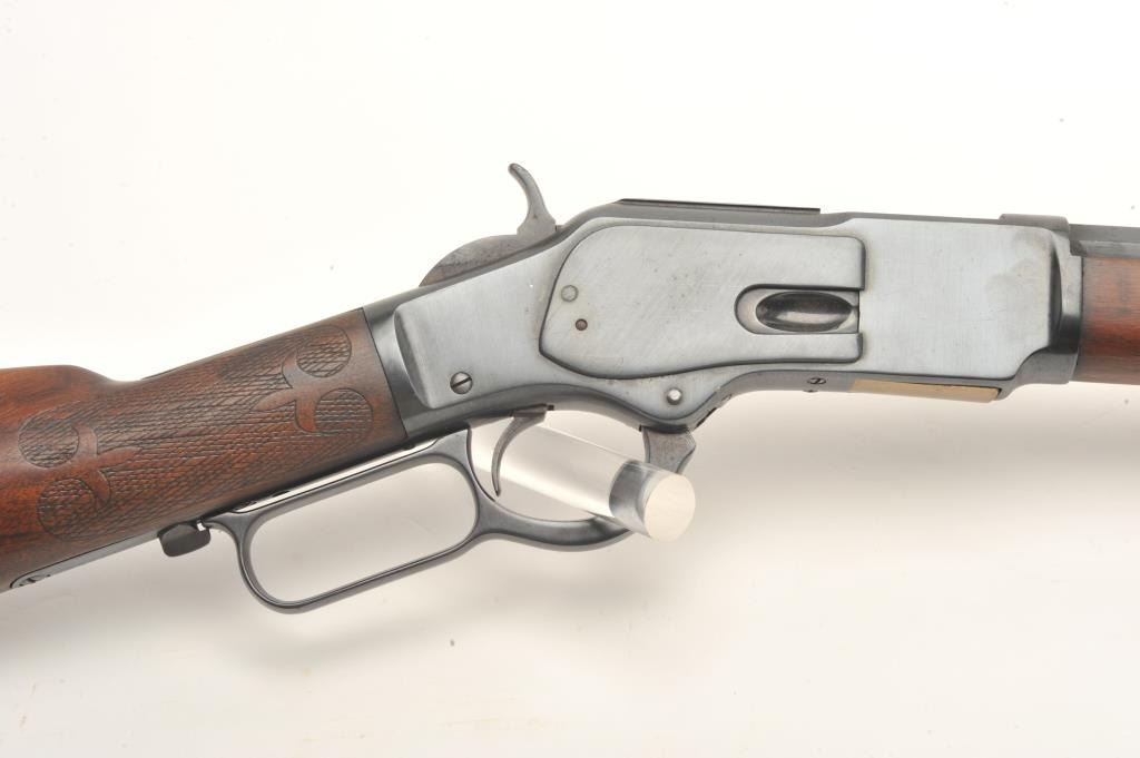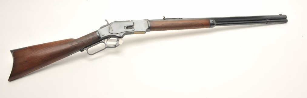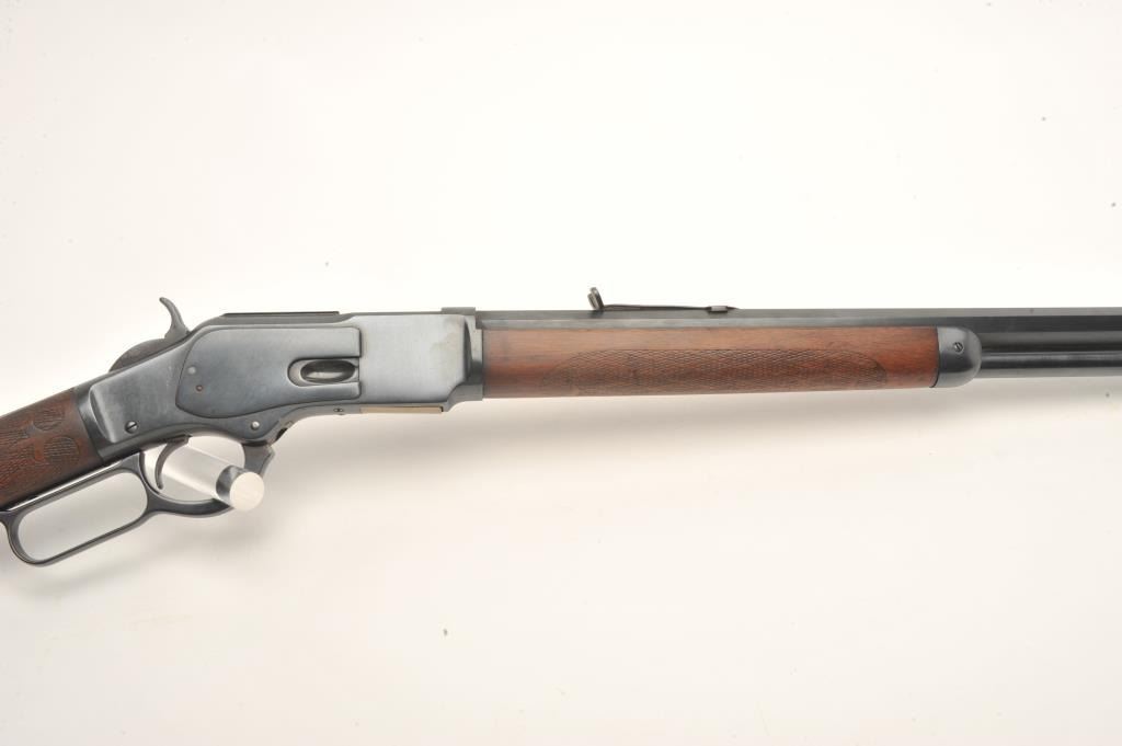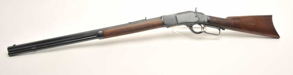 Winchester Model 1873 lever action rifle, .44 W.C.F. caliber, 24” octagon barrel, re-blued finish, wood stocks with later checkering, S/N 327225B, in overall good condition showing the majority of a quality olderre-finish, crisp action, dark bore and good wood. (Antique). Est.: $800-$1,600.