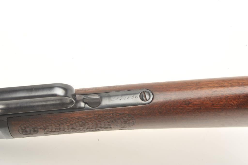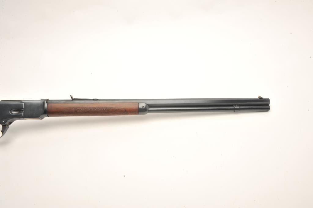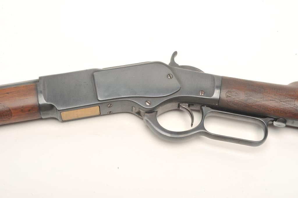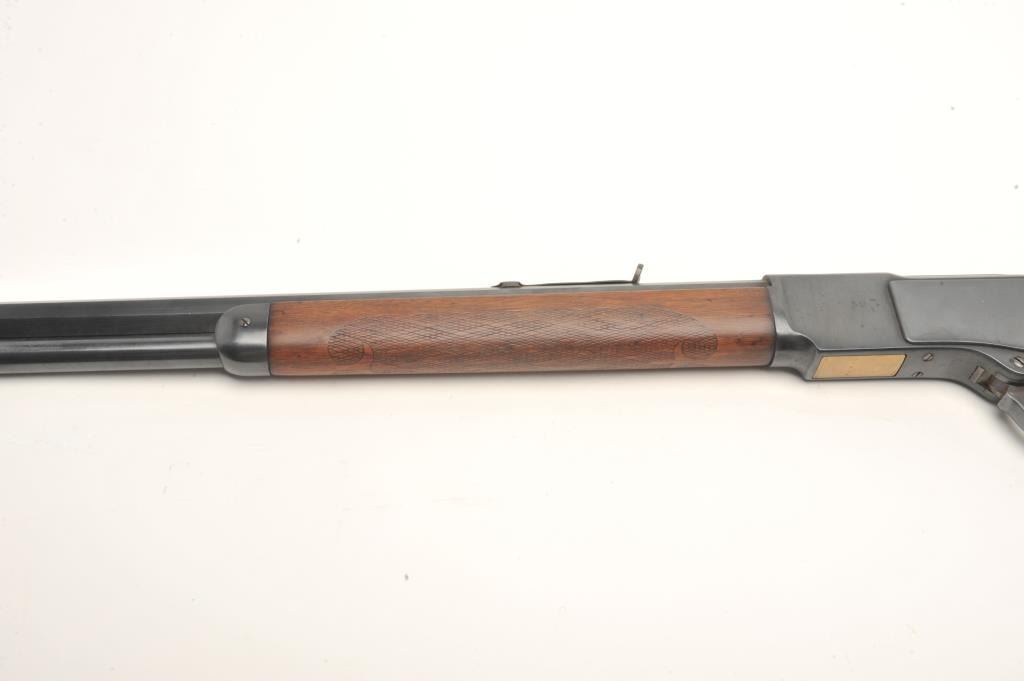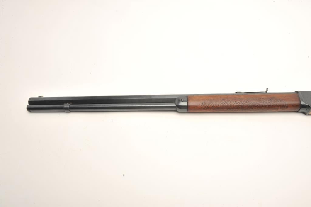 Winchester Model 1873 lever action rifle, .44 W.C.F. caliber, 24” octagon barrel, re-blued finish, wood stocks with later checkering, S/N 327225B, in overall good condition showing the majority of a quality olderre-finish, crisp action, dark bore and good wood. (Antique). Est.: $800-$1,600.