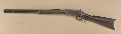 Winchester Model 1873 lever action rifle, .44 WCF cal., 24” octagon barrel, blue finish, plain wood stocks, #299750B. This gun is in overall good condition showing some slight traces of original finish in protected areaswith the balance gone to a dark brown patina; good action and markings; bore should clean to good; rear sight is an unmarked replacement; wood stocks are fair to good showing lots of character wear, old mars andcracks, etc. from years in service, possibly carried in a wagon or buckboard; a classic looking old Winchester. Est.: $1,250-$2,500.