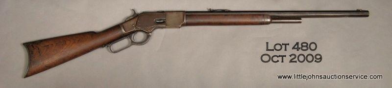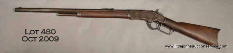 Winchester Model 1873 lever action rifle, .44 cal, 23-1/2” cut down barrel, magazine shortened to half, wood stocks, #32060. This gun is in overall fair + condition with a dark brown patina to metal surfaces, thumbprint dustcover remains, roughbore, good action, fair + butt stock, worn and cracked fore stock, replaced rear sight. Est.: $700-$1,400.