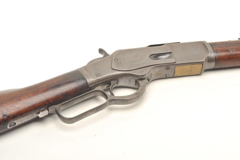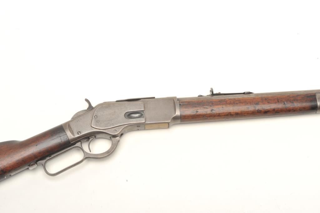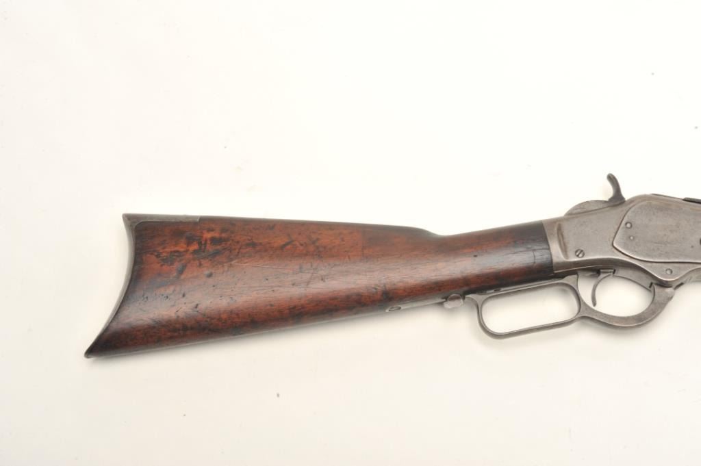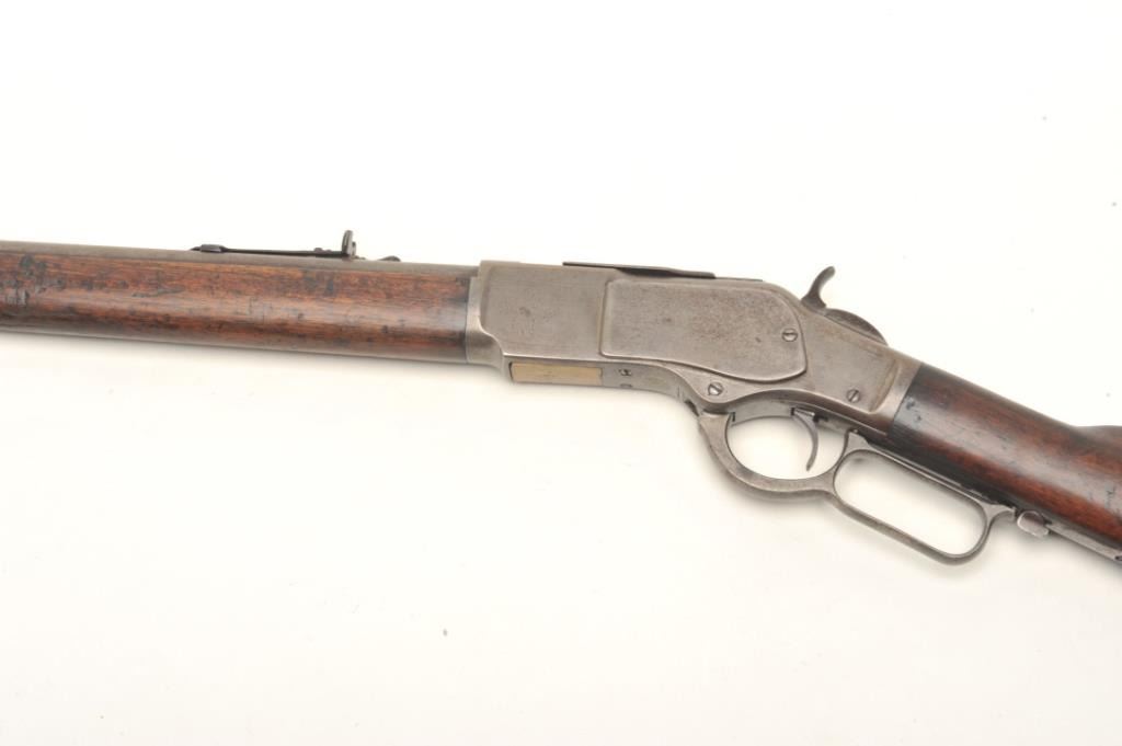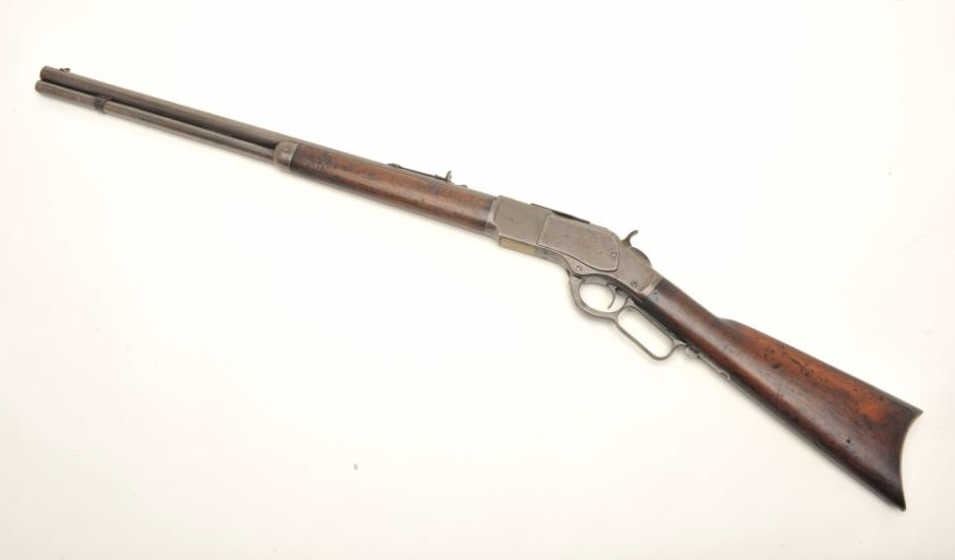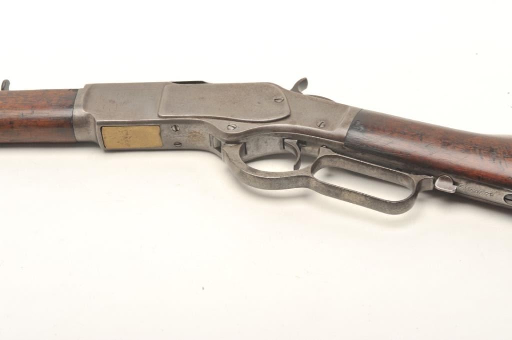 Winchester Model 1873 lever action rifle in .44 caliber SMOOTHBORE, 24” round barrel, 1 of approximately 8 known, even grey/brown patina, wood stocks, S/N 556067, with factory letter stating rifle, .44 caliber, roundbarrel, plain trigger, smoothbore, long chamber, rec’d in warehouse on April 1, 1901 and shipped on April 8, 1901 to special order #92947. Highly desirable and rare, this Winchester may well have been ordered byBuffalo bill, Pawnee Bill, Annie Oakley or other Wild We4st Show legends at the height of those productions. Provenance: James Gordon, author of the Model 1873 book. (Antique). Est.: $6,000-$12,000.