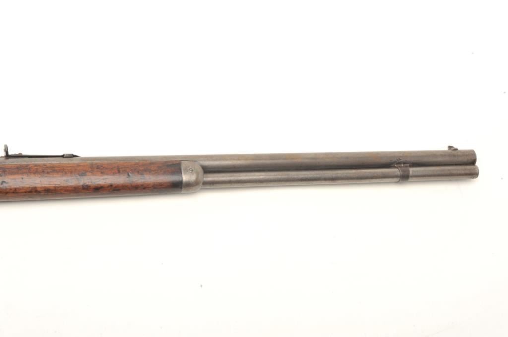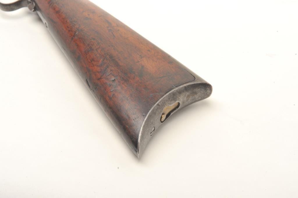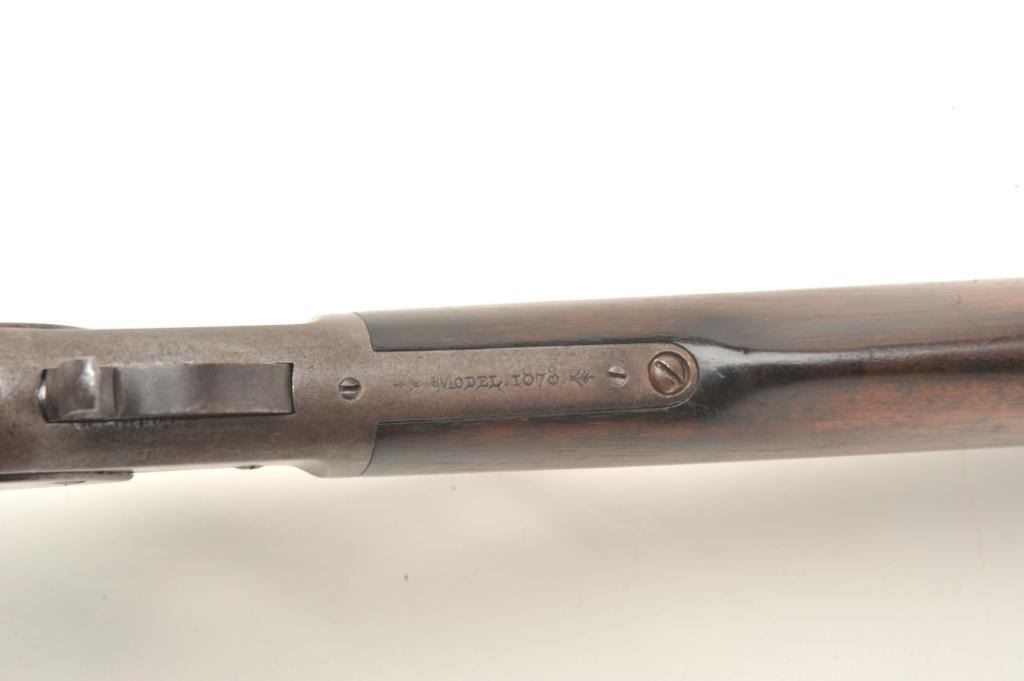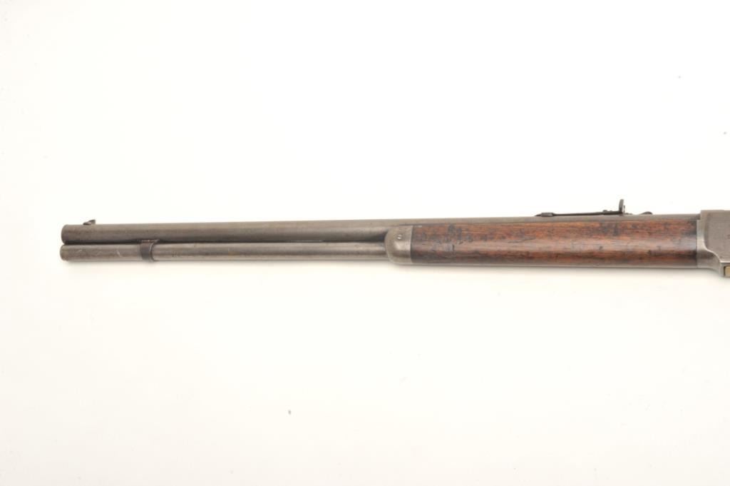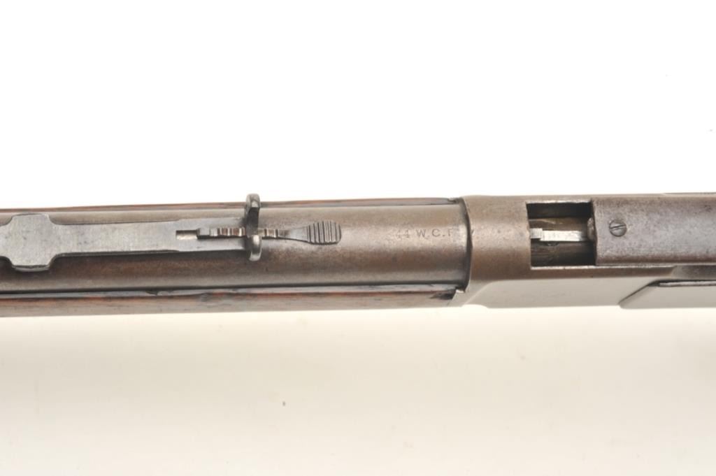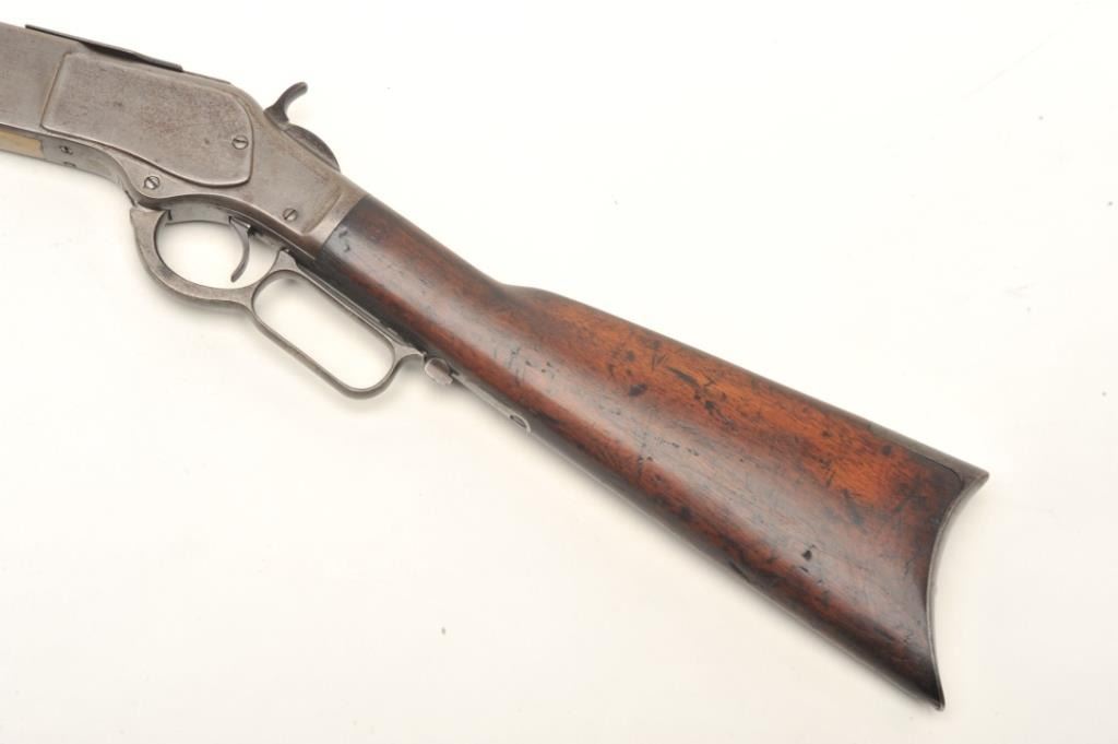 Winchester Model 1873 lever action rifle in .44 caliber SMOOTHBORE, 24” round barrel, 1 of approximately 8 known, even grey/brown patina, wood stocks, S/N 556067, with factory letter stating rifle, .44 caliber, roundbarrel, plain trigger, smoothbore, long chamber, rec’d in warehouse on April 1, 1901 and shipped on April 8, 1901 to special order #92947. Highly desirable and rare, this Winchester may well have been ordered byBuffalo bill, Pawnee Bill, Annie Oakley or other Wild We4st Show legends at the height of those productions. Provenance: James Gordon, author of the Model 1873 book. (Antique). Est.: $6,000-$12,000.