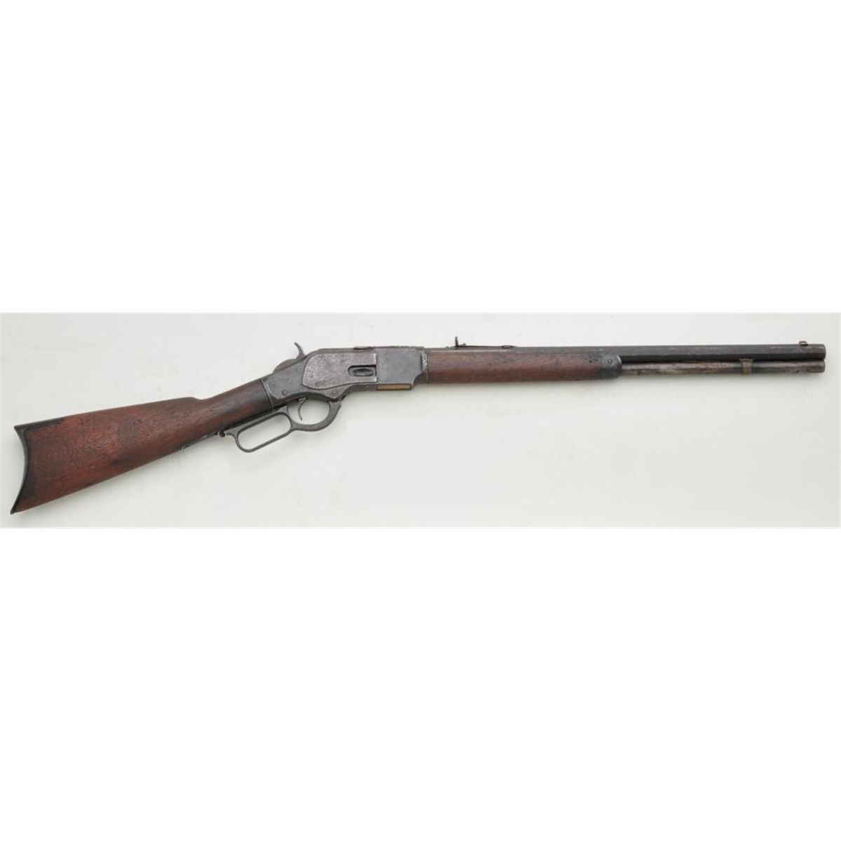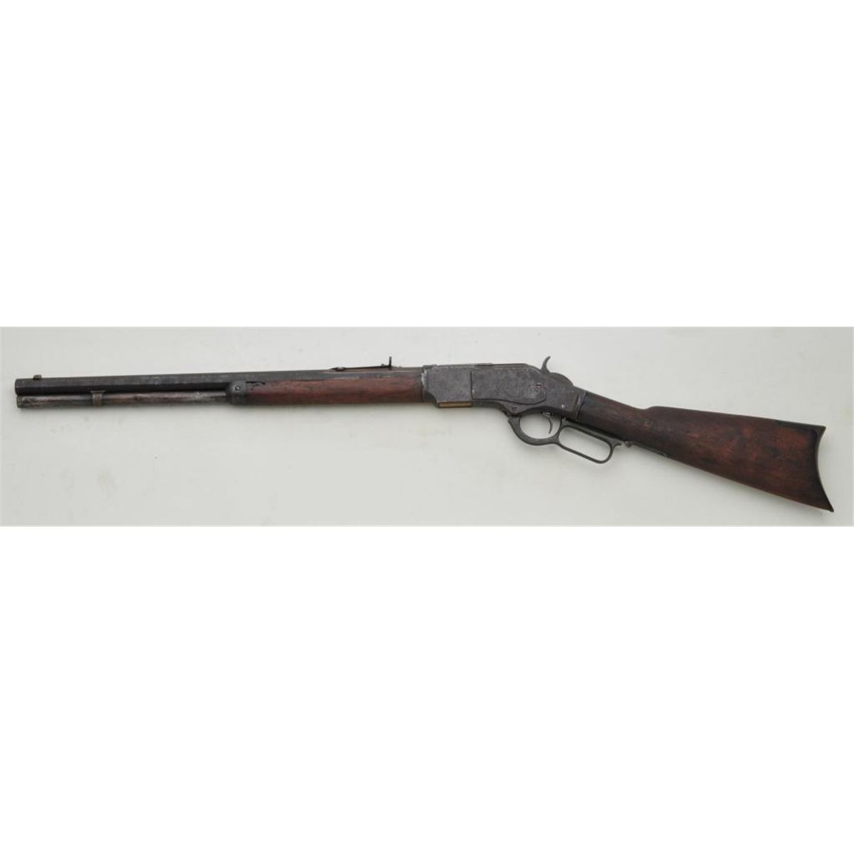 Winchester Model 1873 lever action rifle in relic condition, .44 cal., 20” octagon barrel, wood stocks, #689281B. This old workhorse displays a heavy dark patina over moderate pitting with a dark bore,functioning action and weathered wood stocks; un-cleaned and displaying a classic look! This truly is a piece that qualifies the statement: “If only this gun could talk . . . “. Est.: $500-$1,000.