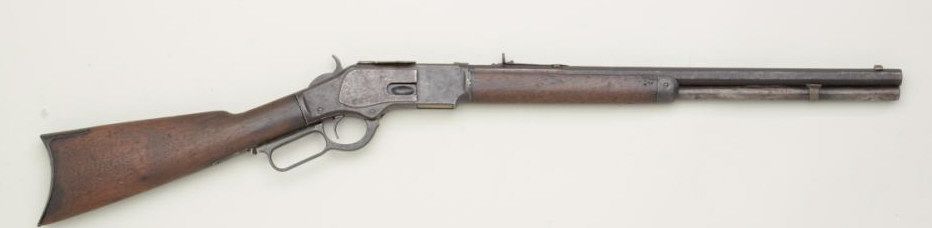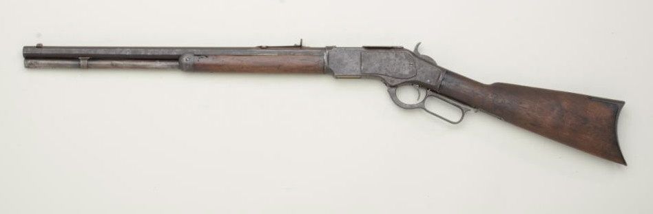 Winchester Model 1873 lever action rifle in relic condition, .44 cal., 20” octagon barrel, wood stocks, #689281B. This gun shows a heavy dark patina over moderate pitting; bore is dark but action is still good; woodstocks are weathered and displaying a classic Western look; uncleaned and would make a great display piece. Est.: $500-$1,000.