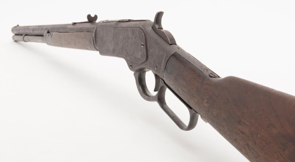 Winchester Model 1873 lever action rifle in relic condition, .44 cal., 20” octagon barrel, wood stocks, #689281B. This gun shows a heavy dark patina over moderate pitting; bore is dark but action is still good; wood stocks are weatheredand displaying a classic Western look; uncleaned and would make a great display piece. Est.: $500-$1,000.