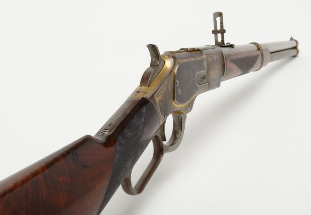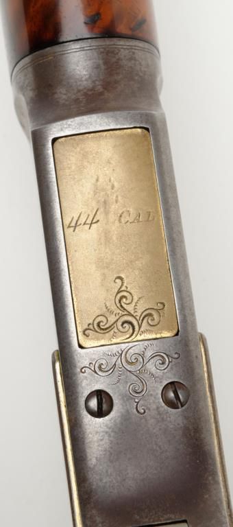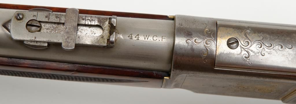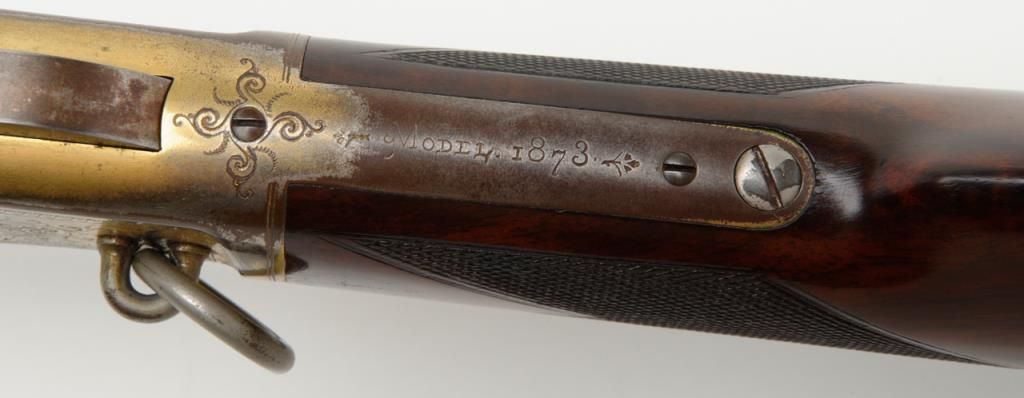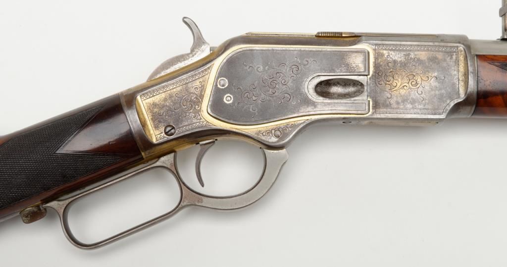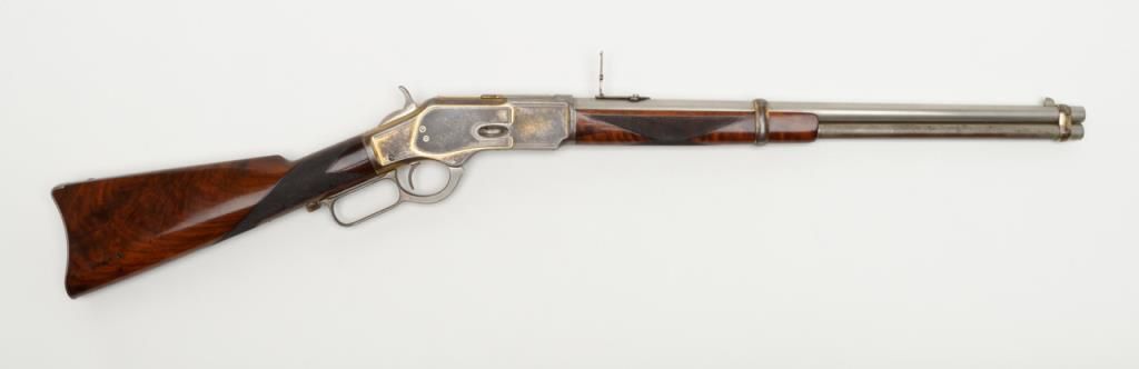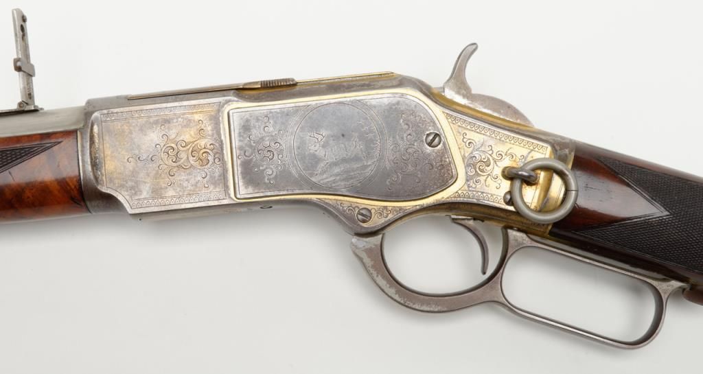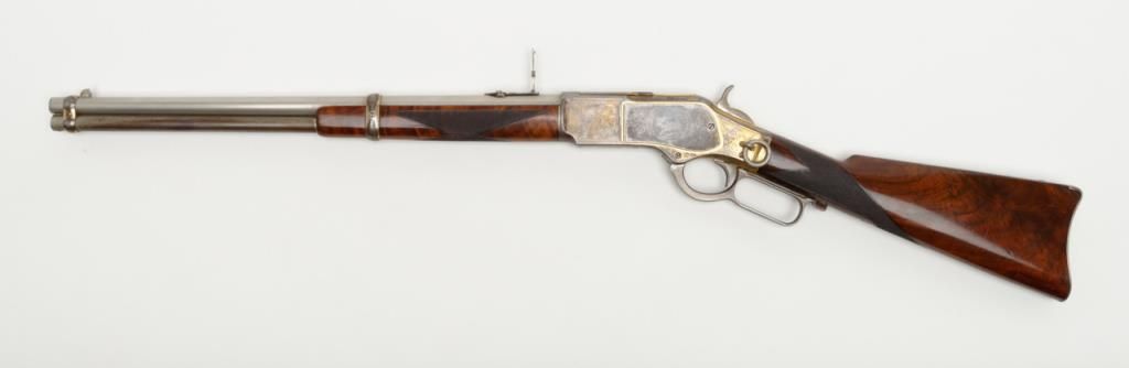 Winchester Model 1873 saddle ring carbine, factory engraved, gold and nickel plated with deluxe fancy checkered burl walnut stocks retained by Winchester and used as an exhibition gun from 1895 until 1903 and displayed at the New YorkExposition 1898, Pan-American International Exhibition 1901, serial number 205250, original received in the warehouse March 28th,1895. The longest factory letter we have ever viewed in our cataloging history details 20 different occasionsof being received or shipped by the factory. The letter specifically mentions engraving, gold and nickel plate, restocking with fancy stock, refinishing, repairing, and many other interesting entries too numerous to record herein but we will provide a copy to any interested party or prospective buyer. The carbine retains 90% to 95% original soft factory nickel on the barrel that is toning and aging nicely. The magazine tube retains 30% to 50% factory nickel and a goodpatina where the finish has lifted. The barrel bands show 20% to 40% original factory gold within an un-cleaned patina. The frame shows 10% to 20% rich original factory gold plate with the balance and an un-cleaned patina. The engraving is a