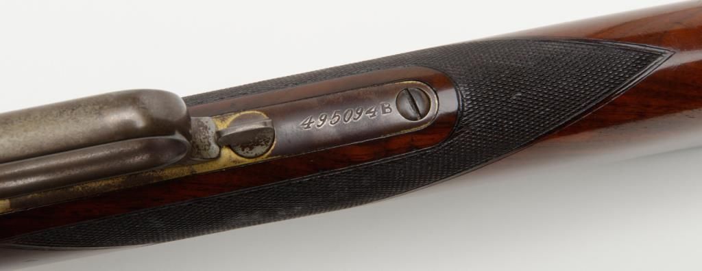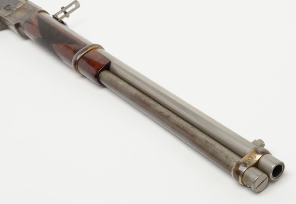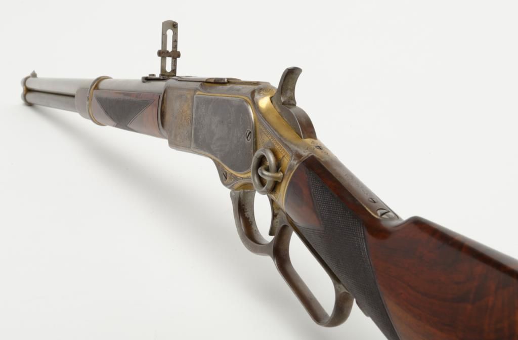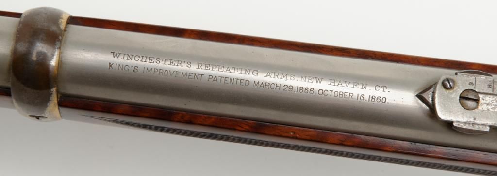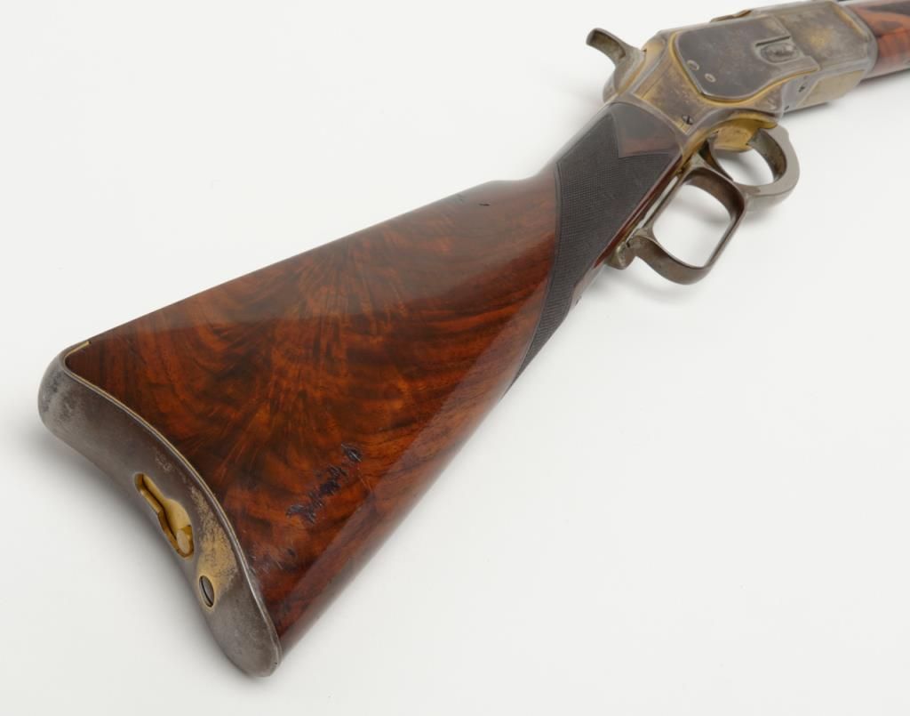 Winchester Model 1873 saddle ring carbine, factory engraved, gold and nickel plated with deluxe fancy checkered burl walnut stocks retained by Winchester and used as an exhibition gun from 1895 until 1903 and displayed at the New YorkExposition 1898, Pan-American International Exhibition 1901, serial number 205250, original received in the warehouse March 28th,1895. The longest factory letter we have ever viewed in our cataloging history details 20 different occasionsof being received or shipped by the factory. The letter specifically mentions engraving, gold and nickel plate, restocking with fancy stock, refinishing, repairing, and many other interesting entries too numerous to record herein but we will provide a copy to any interested party or prospective buyer. The carbine retains 90% to 95% original soft factory nickel on the barrel that is toning and aging nicely. The magazine tube retains 30% to 50% factory nickel and a goodpatina where the finish has lifted. The barrel bands show 20% to 40% original factory gold within an un-cleaned patina. The frame shows 10% to 20% rich original factory gold plate with the balance and an un-cleaned patina. The engraving is a