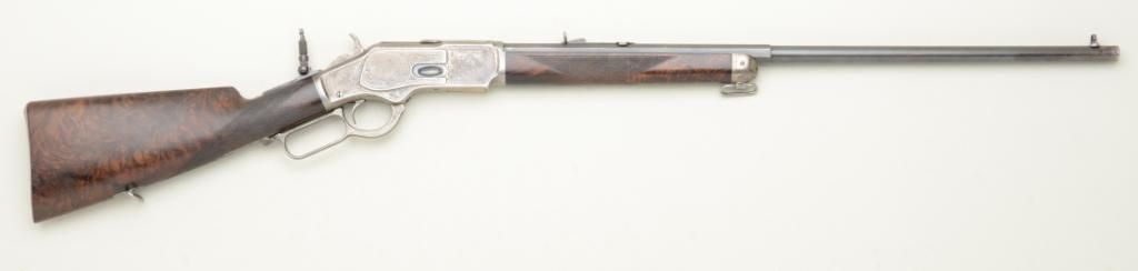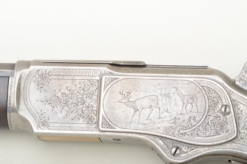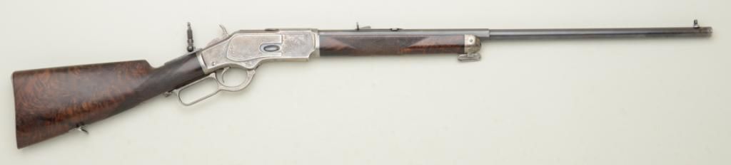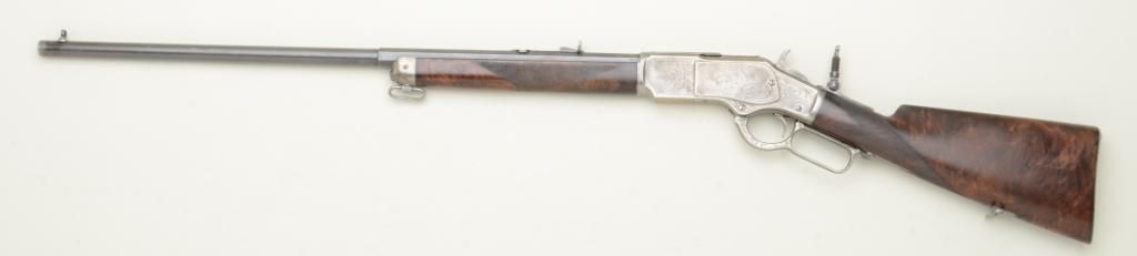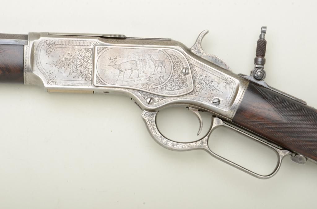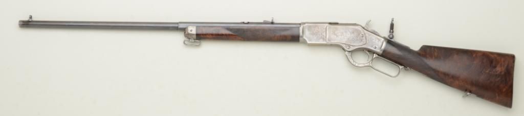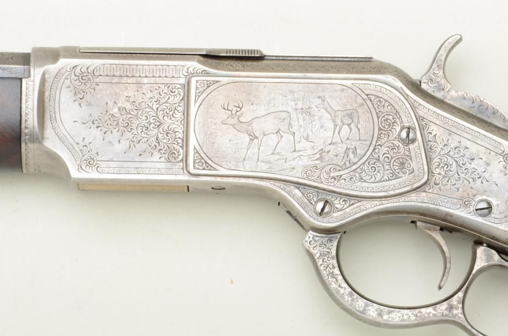Winchester Model 1873 special order lever action rifle, .38-40 cal., 26" half round/half octagon barrel, button magazine, blue and case hardened finish, deluxe factory engraved at a cost of $15.00, signed by"Ulrich"; deluxe checkered stock , sling swivels, Lyman tang sight, beech front sight, standard rear sight and original dove tail, #335484B. Pictured page 158 Winchester Engraving by R. L. Wilson. The engraving isof a very high quality and expensive nature with portrait of stag and doe on left side plate, surrounded by tight scrolls and portrait of mountain lion on right side plate, also surrounded by tight and finescrolls with extra finish trim and very unusual engraving similar to 1 of 1,000 on breech and muzzle. The barrel retains 60-80% original blue with some toning and normal aging, the frame, lever, hammer and forendshow strong traces of original case hardening, drifting to silvery gray. The loading gate shows 60% thinning original blue finish, the stocks are good to very good with some minor marks, light cleaning with