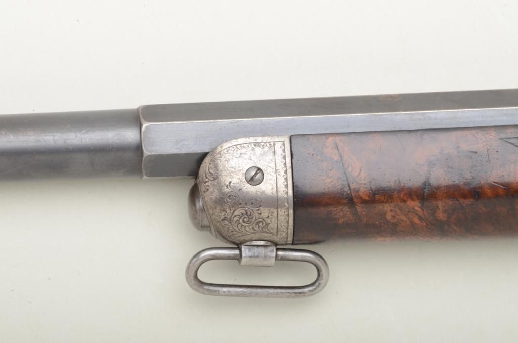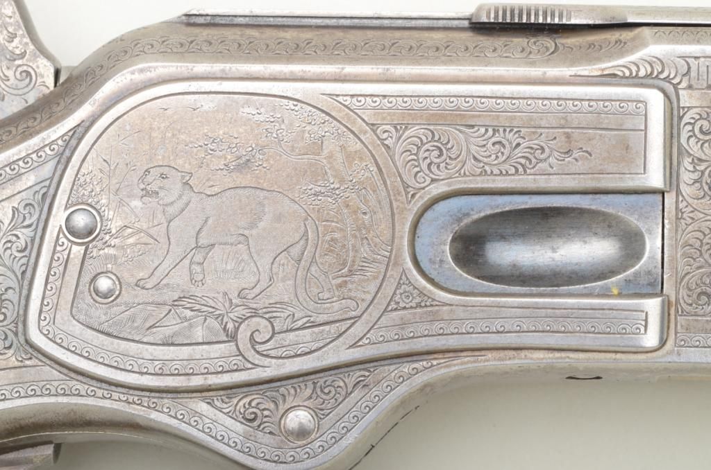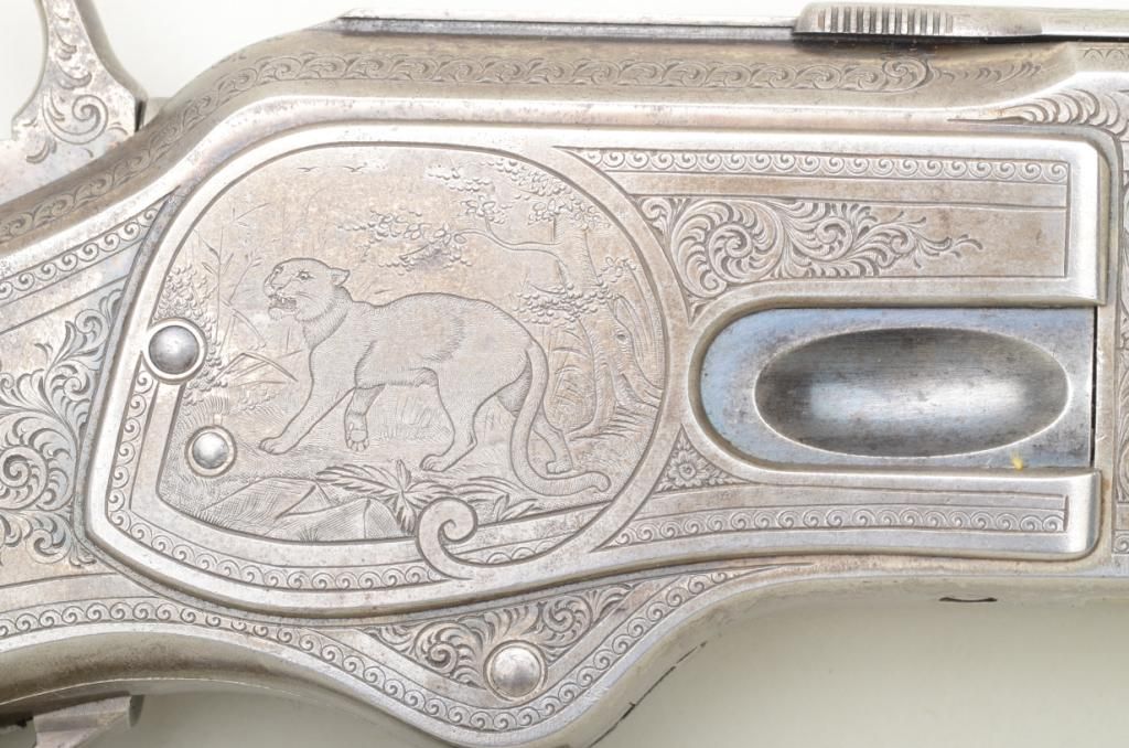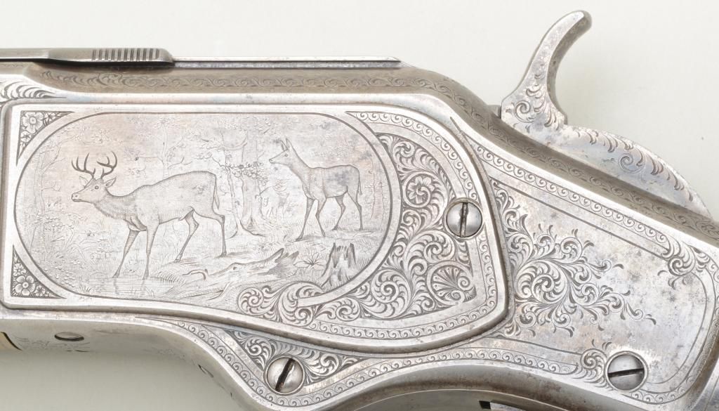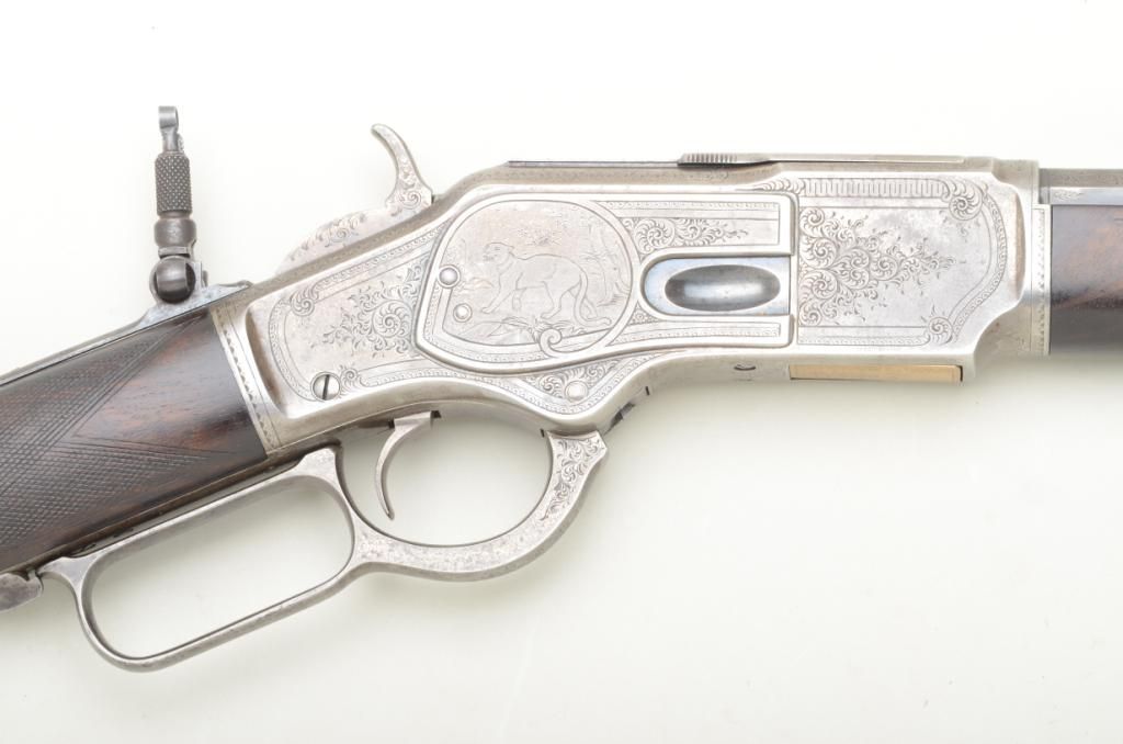 Winchester Model 1873 special order lever action rifle, .38-40 cal., 26" half round/half octagon barrel, button magazine, blue and case hardened finish, deluxe factory engraved at a cost of $15.00, signed by"Ulrich"; deluxe checkered stock , sling swivels, Lyman tang sight, beech front sight, standard rear sight and original dove tail, #335484B. Pictured page 158 Winchester Engraving by R. L. Wilson. The engraving isof a very high quality and expensive nature with portrait of stag and doe on left side plate, surrounded by tight scrolls and portrait of mountain lion on right side plate, also surrounded by tight and finescrolls with extra finish trim and very unusual engraving similar to 1 of 1,000 on breech and muzzle. The barrel retains 60-80% original blue with some toning and normal aging, the frame, lever, hammer and forendshow strong traces of original case hardening, drifting to silvery gray. The loading gate shows 60% thinning original blue finish, the stocks are good to very good with some minor marks, light cleaning with