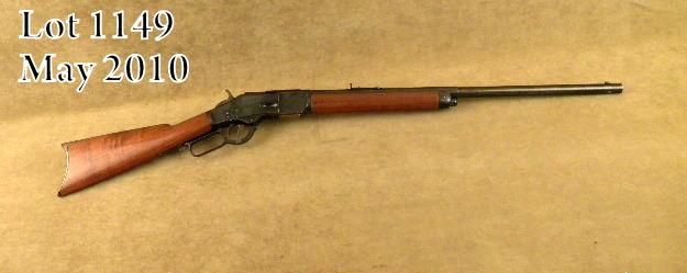 Winchester Model 1873 special order rifle, 44-40 cal., 24” half round/half octagon barrel, button mag., second model with screwed down rail for dust cover, #65721. The barrel retains approx. 50%-70% thinning and toning blue finish, some areas oflight erosion, staining and pin prick pitting just starting; the barrel address is sharp; the edges crisp; the frame shows 75%-85% bright blue, some drifting, scratches and light beginning erosion; the hammer and lever show considerable casehardening; the stocks are near excellent with beautiful light color and most original varnish, just a few slight handling marks and miniscule losses at edges; the action is crisp, the bore is bright and may clean to excellent; a very crispsecond model ’73 that had very little use. Est.: $5,000-$10,000.