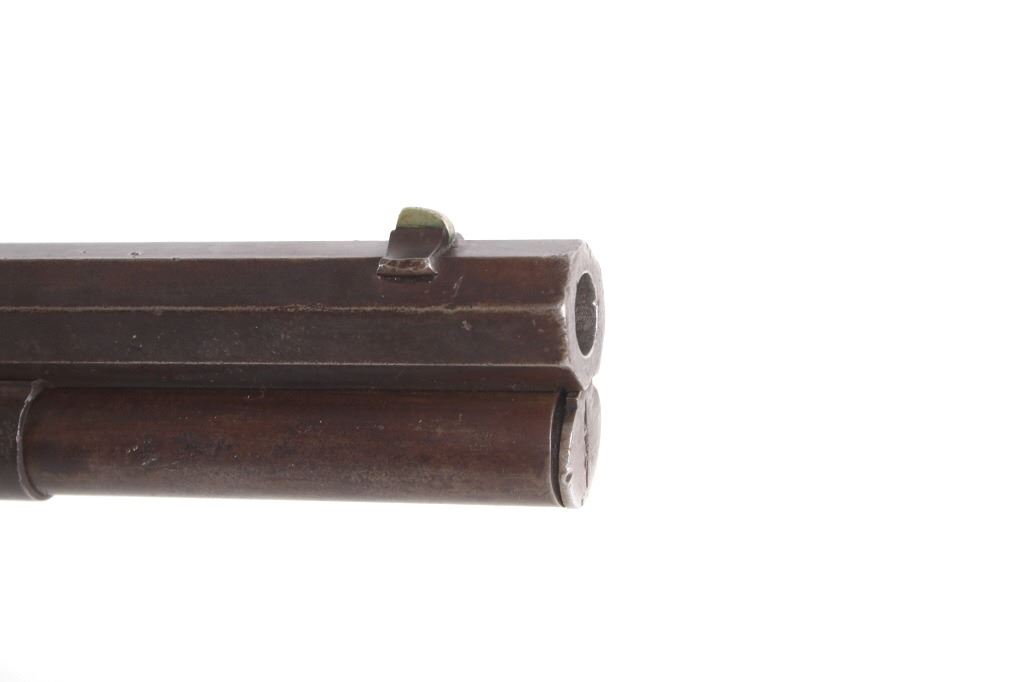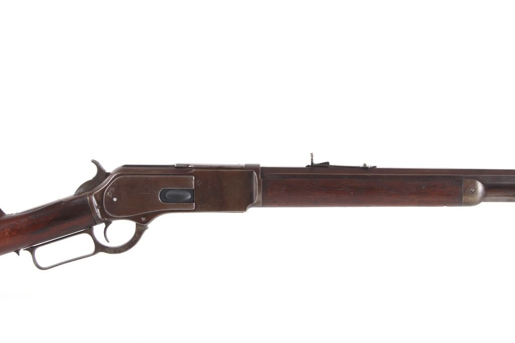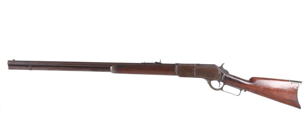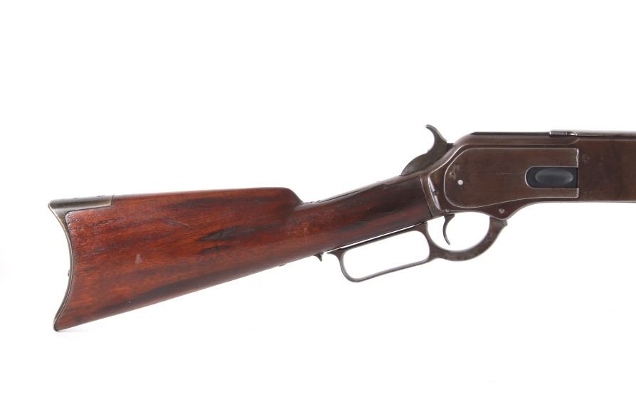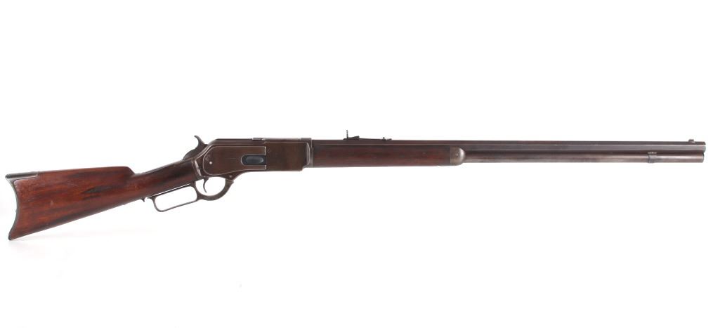 throughout the West that he had special ordered from Winchester. The Model 1876 was a serious, specialized rifle that was made in limited quantities. It was replaced by the Model 1886 in that same year. This rifle with 28” octagon barrel is chambered in the powerful and popular caliber .45-60. This cartridge held a .45 caliber lead bullet weighing 300 grains in front of a full 60 grains of black powder. This was a very potent cartridge that was used successfully on elk, grizzly bears and even buffalo, which were hunted in Montana as late as 1883. Most surviving 1876 rifles show very heavy frontier use and often abuse. This early example is in much finer condition than normally encountered today. The