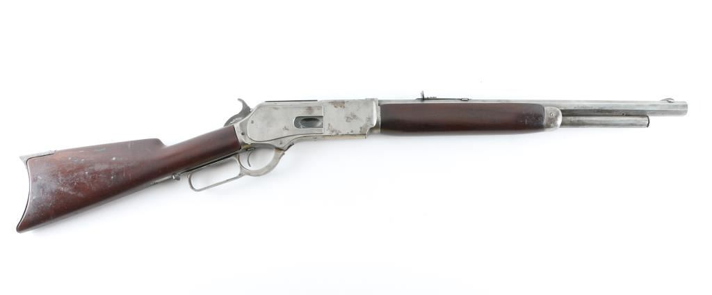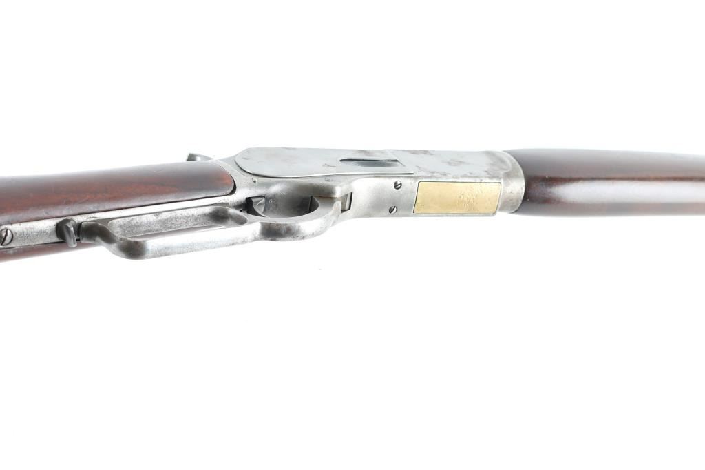 'King's Improvement' marked lever action rifle manufactured circa 1887. Features 19" octagon barrel (probably gunsmith shortened long ago), nearly full length magazine tube, dovetailed blade front sight, buckhorn rear sight, straight wrist, finger lever latch, dust cover absent, steel crescent buttplate, walnut stocks (possible replacement wood). Bore is fair condition, fairly bright with good rifling, showing light roughness and scattered tiny pits throughout. Metal surfaces show a dull silver or gray color, some traces of finish in protected corners, patina or light pitting in many places, some areas such as barrel flats show signs of cleaning. Slightly rough texture on receiver sides. Staking punch marks around front sight. Brass lifter is dented, making the caliber marking a bit hard to read. Barrel markings are good. Model marking on upper tang is deep, with many pits in the same area. Missing the rear tang screw. Forend is good condition, a bit loose, with small dents and scratches. Butt stock is good condition, showing erosion at tang (appears due to sanding). Buttplate fit is fair, mounted a bit off centerline. Condition is NRA Good *** Antique Firearm ***