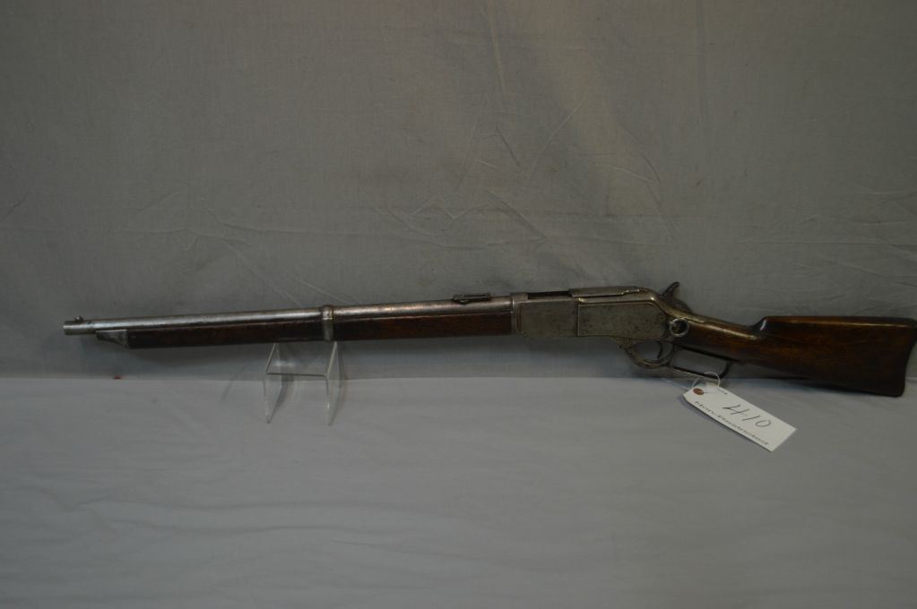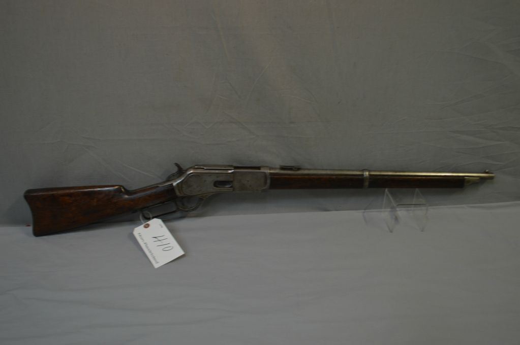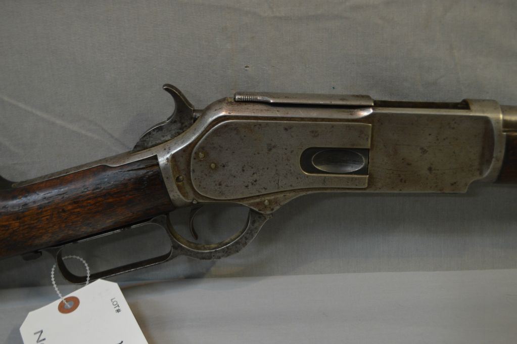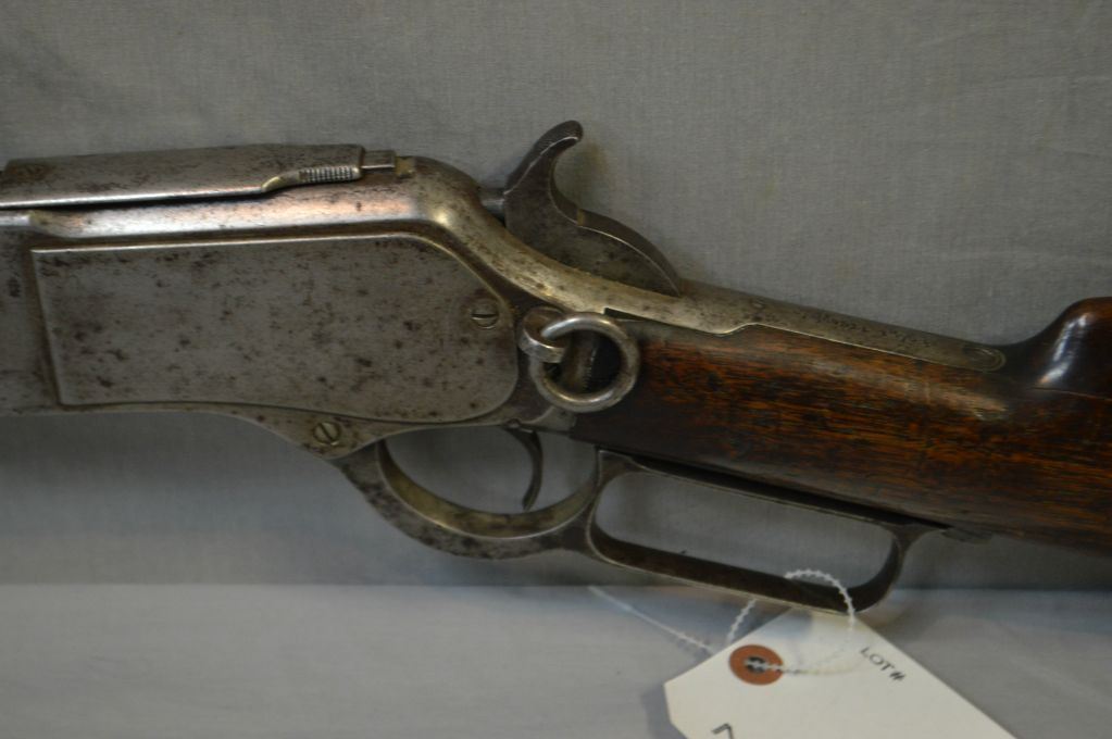 Winchester Model 1876 .45 - 75 Cal Lever Action Full Wood Saddle Ring Carbine w/ 22" bbl [ faint traces of blue turning brown, in protected areas, majority of areas turned grey, barrel sights, back sight dated 1876, dust cover with integeral rail, with side grooves, brass lift plate, no trap in carbine metal butt plate, wood has slight cracks behind upper tang and small chips behind the receiver, normal bumps & bruises overall, but appears original to the firearm, faint traces of flaking case color, all turned silver, functions well, Circa 1883 ] Ser # 38030