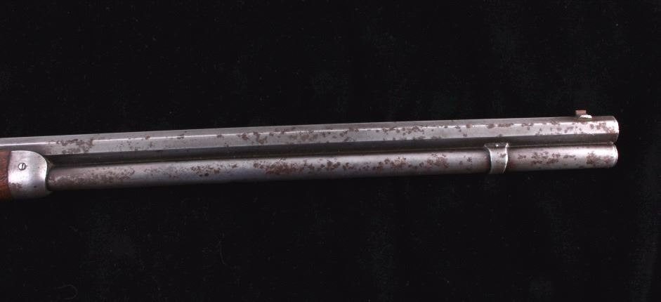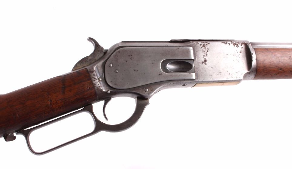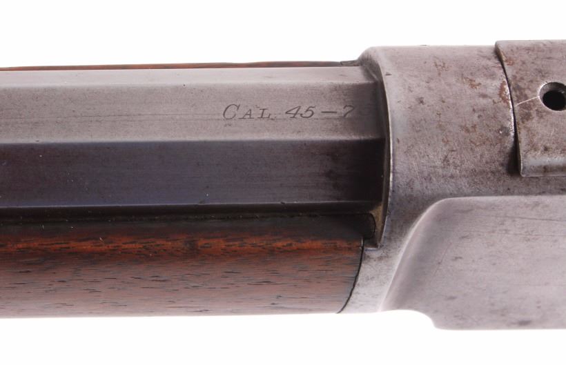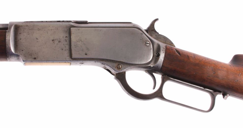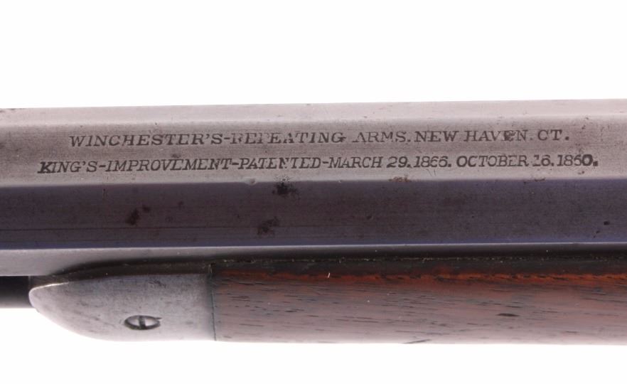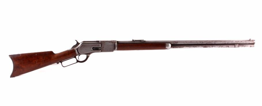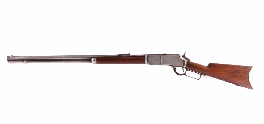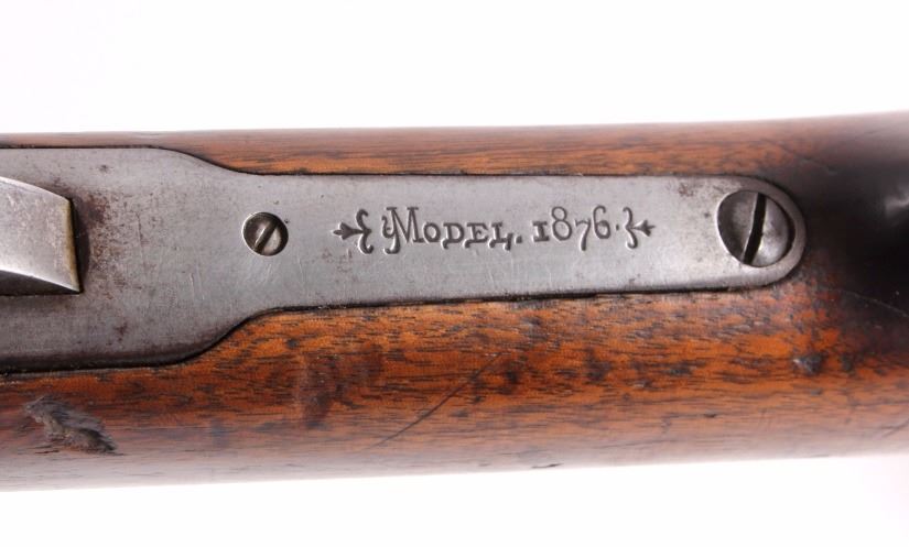 This is a Winchester Model 1876 lever action rifle chambered in the .45-75 caliber manufactured in 1886. The rifle features a solid walnut hardwood stock with crescent butt stock. It has a full octagon barrel that is marked "Winchester's Repeating Arms New Haven, CT. / King's-Improvement Patented March 29, 1866 October 16, 1866" and "Cal 45-75". The butt stock features a cleaning kit compartment built in. The Winchester Model 1876 rifle is in good overall condition. Serial number is 58776 and was manufactured in 1886. No FFL transfer required. The rifle measures 49" long with a 28" barrel.