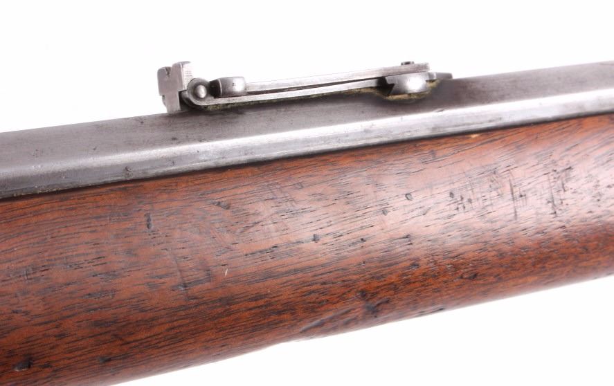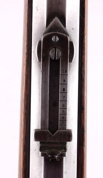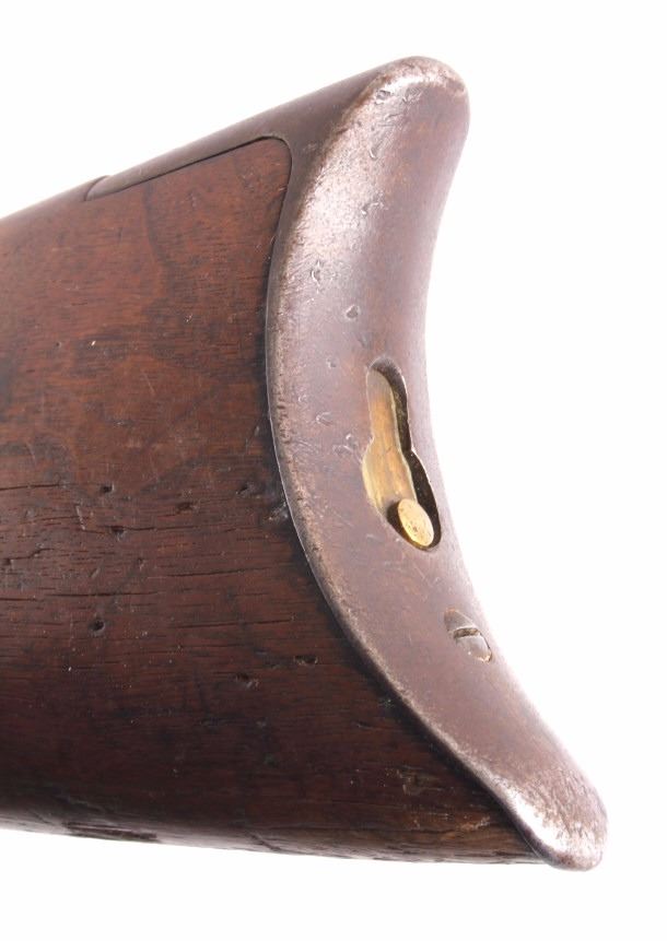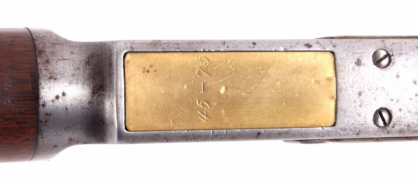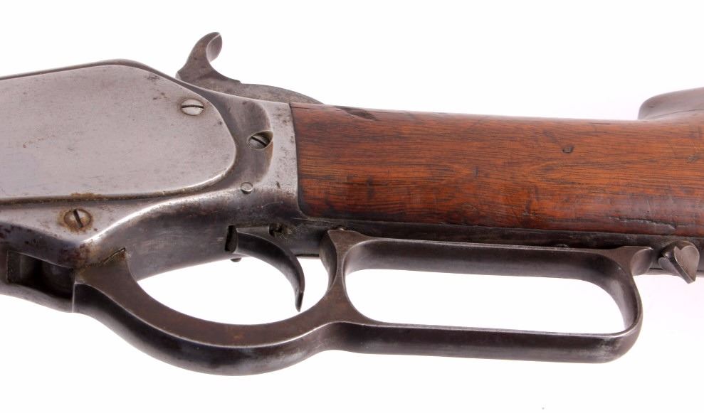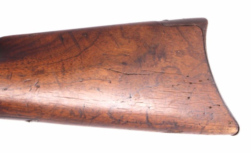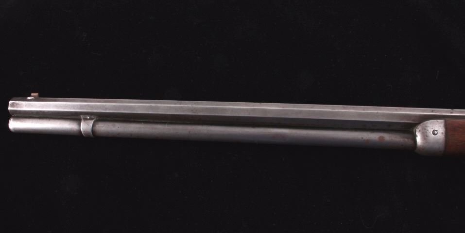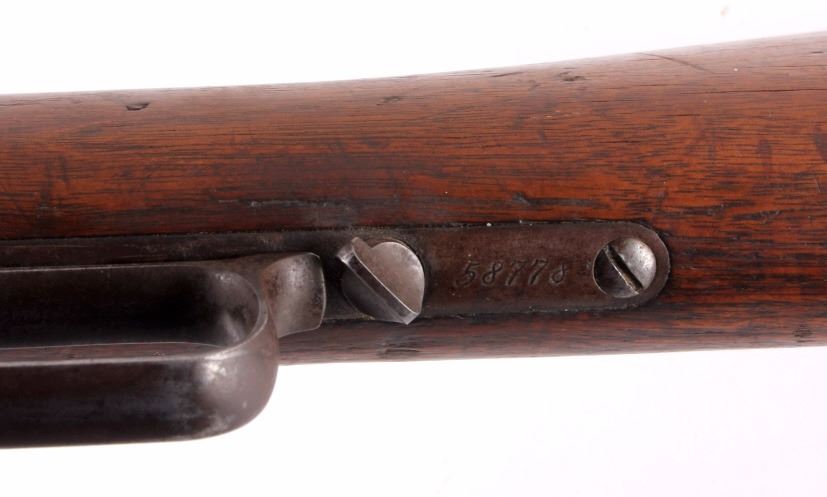 This is a Winchester Model 1876 lever action rifle chambered in the .45-75 caliber manufactured in 1886. The rifle features a solid walnut hardwood stock with crescent butt stock. It has a full octagon barrel that is marked "Winchester's Repeating Arms New Haven, CT. / King's-Improvement Patented March 29, 1866 October 16, 1866" and "Cal 45-75". The butt stock features a cleaning kit compartment built in. The Winchester Model 1876 rifle is in good overall condition. Serial number is 58776 and was manufactured in 1886. No FFL transfer required. The rifle measures 49" long with a 28" barrel.