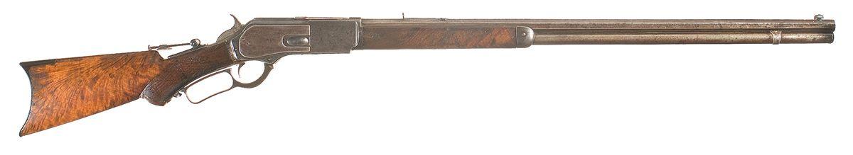 Third Model produced in 1883, standard marking, Marbles blade front sight, elevator absent from rear sight, tang peep sight, ebony insert on bottom of pistol grip, deluxe checkered wood lightly sanded.
