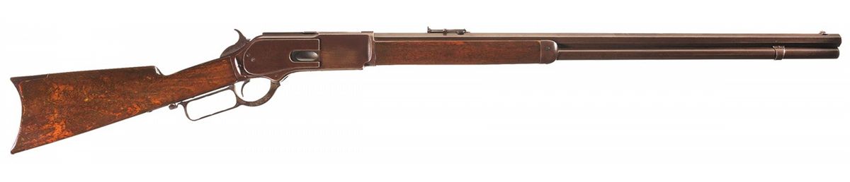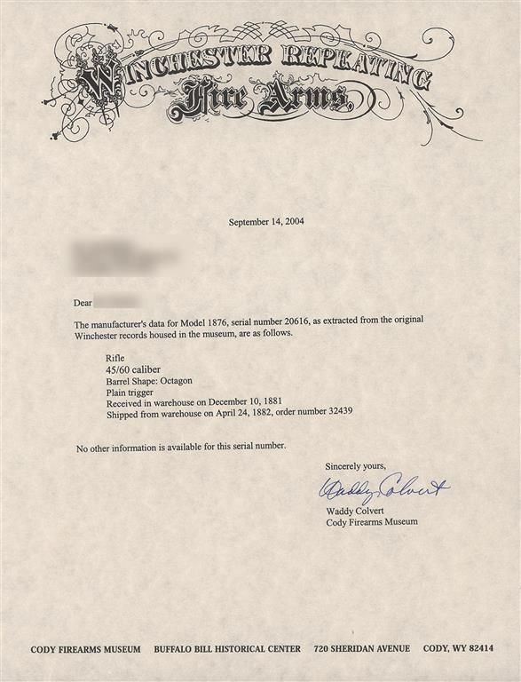Manufactured in 1881, this is a Second Model rifle with the dust cover guide rail attached to the top of the receiver by two screws. The top barrel flat is marked "WINCHESTER'S REPEATING ARMS. NEW HAVEN. CT/KING'S IMPROVEMENT-PATENTED-MARCH 29, 1866. OCTOBER 16. 1860" ahead of the rear sight and "CAL 45-60" at the breech. The bottom of the cartridge carrier is marked "45-60", the upper tang is marked "MODEL 1876" and the serial number is located on the rear of the lower tang. Blade front and folding ladder rear sights and mounted with a smooth walnut forearm with steel end cap and straight grip stock with a steel crescent buttplate and buttstock compartment (cleaning rod not included). The accompanying factory letter verifies the rifle configuration, caliber, octagon barrel, plain trigger, that it was received in the warehouse on December 10, 1881 and shipped to order number 32439 on April 24, 1882.